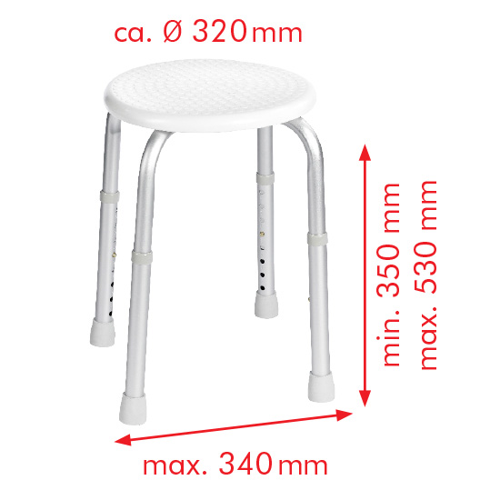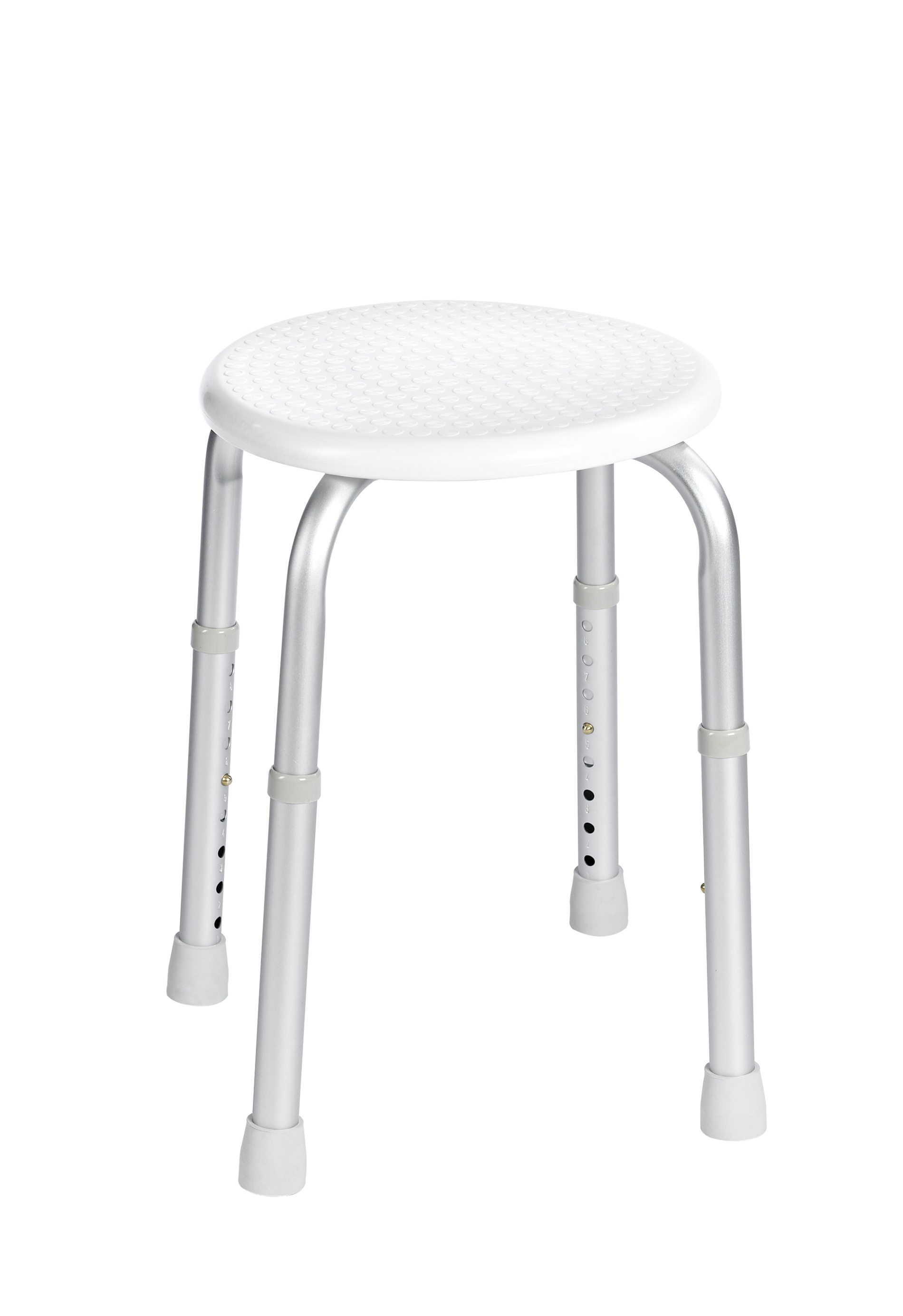 Denne badeskammel kommer i en elegant hvid farve og er fremstillet af pulverlakeret aluminium og polypropylen, hvilket gør den både holdbar og let at rengøre. Målene på skamlen er 34 cm i diameter og kan justeres i højden fra 35 til 53 cm, med en sædedybde på 32 cm. Den maksimale bæreevne er 110 kg, og sædet er lavet af 100 % polypropylen, hvilket giver en behagelig og praktisk løsning til dit badeværelse.