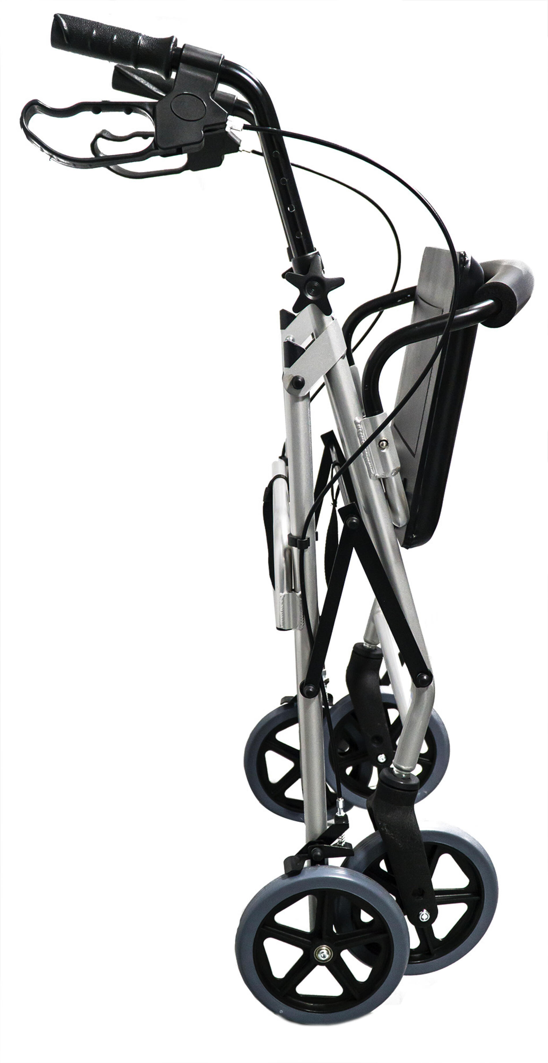 Denne rollator er nem at folde sammen og har både håndbremse og parkeringsbremse for ekstra sikkerhed. Sædet er behageligt at sidde på, med en sædehøjde på ca. 54 cm, og den har et aftageligt, polstret ryglæn for ekstra komfort.