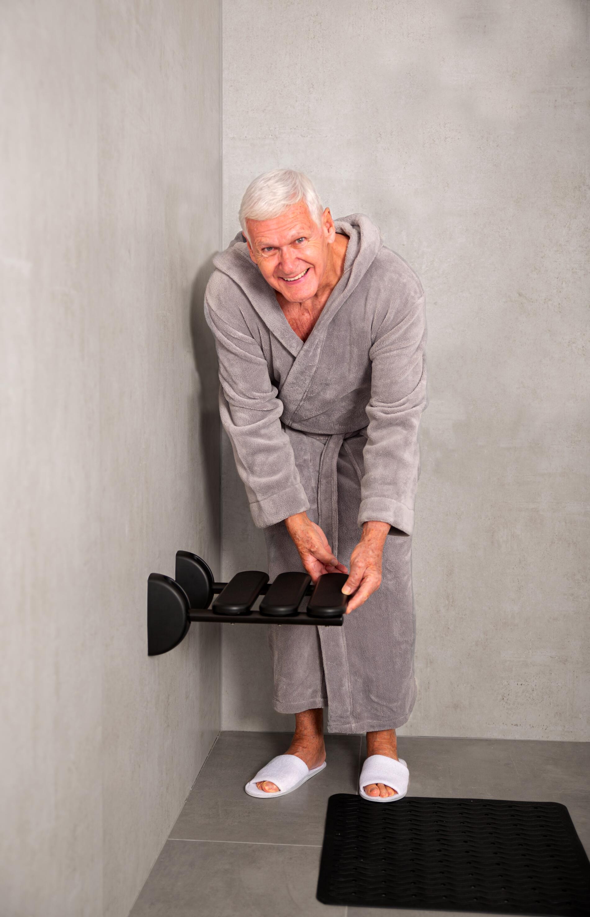 En af de største fordele ved dette sæde er dets sammenklappelige design. Når det ikke er i brug, kan det nemt foldes op mod væggen, hvilket sparer værdifuld plads på dit badeværelse. Dette gør det til en ideel løsning for mindre badeværelser, hvor pladsen er begrænset, men komfort stadig er en prioritet.