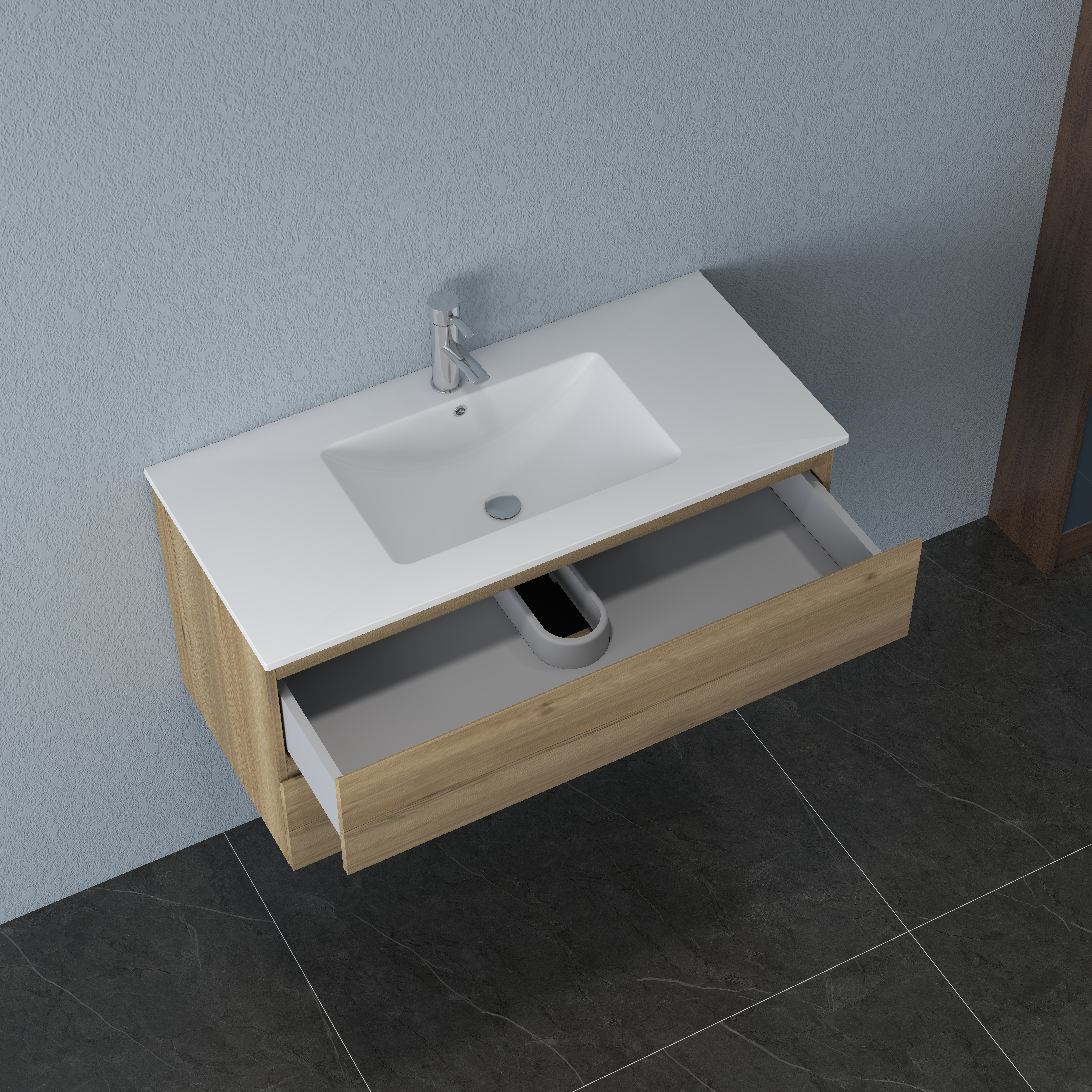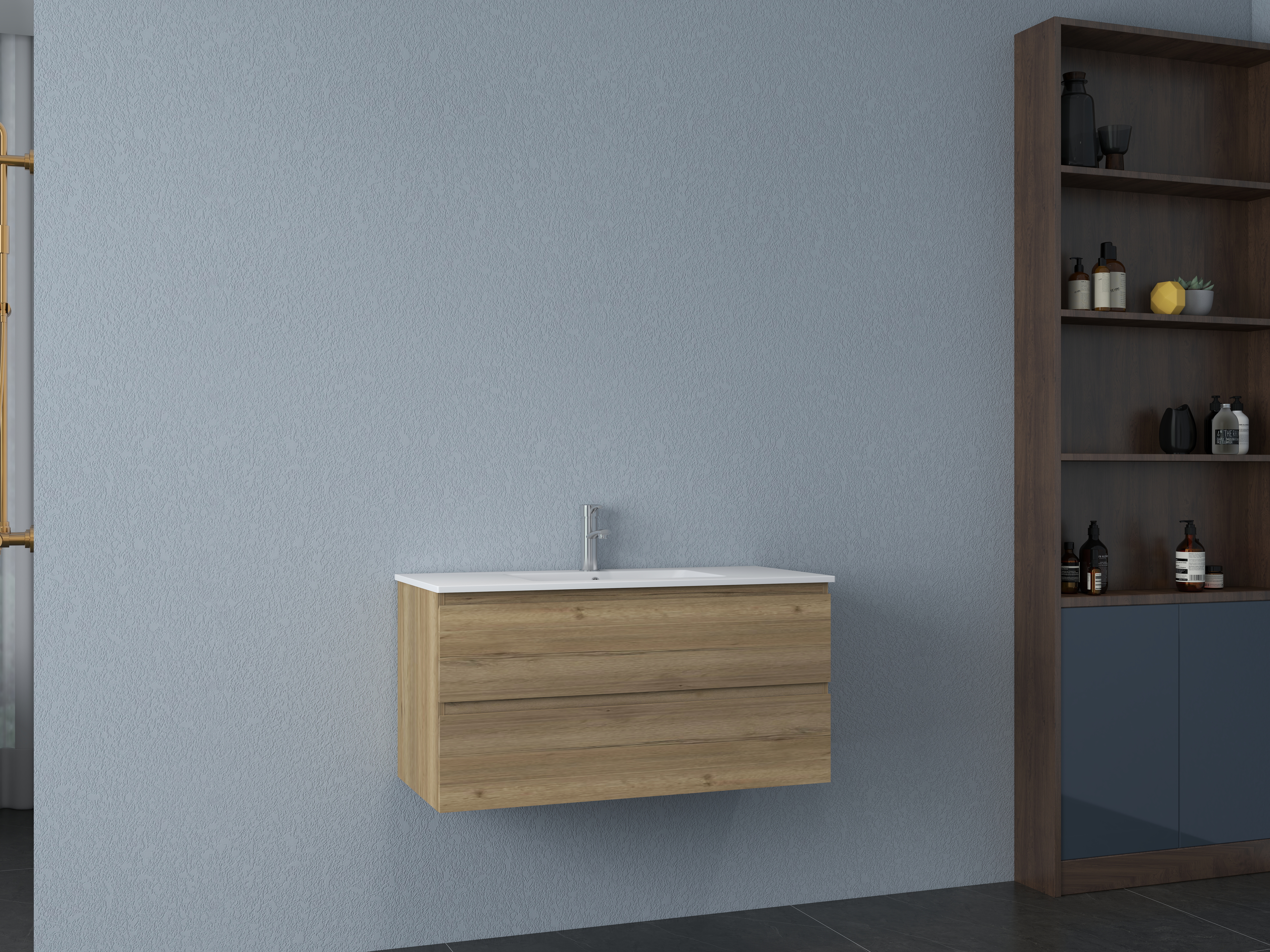 De flotte designgreb og de skarpe kanter giver møbelsættet et moderne touch, der kombinerer smart opbevaring med et elegant og tidssvarende udtryk, perfekt til både de mindre og store badrum.