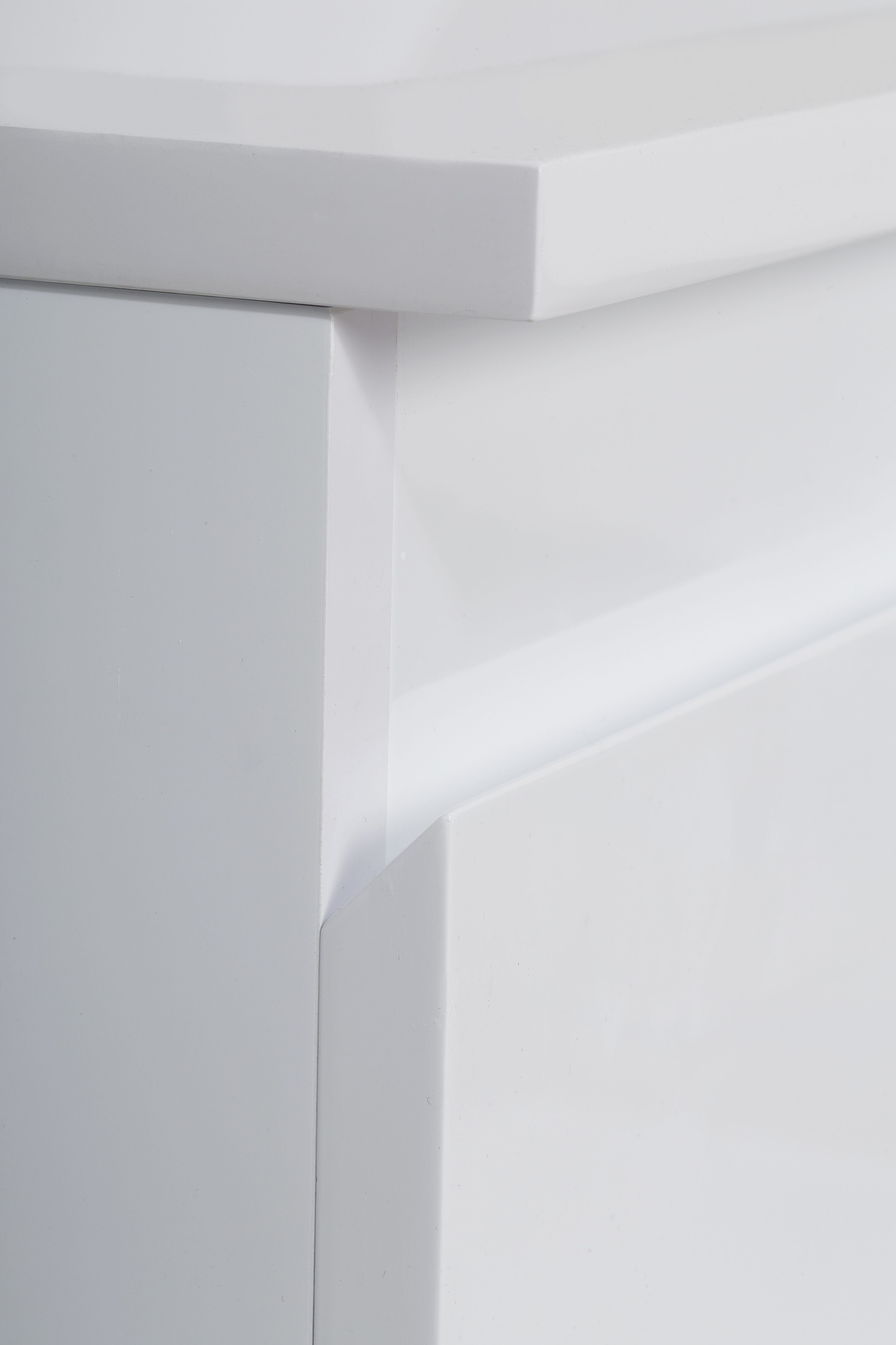 Møblet har stilfulde kanter på skufferne, hvilket giver et skarpt og nutidigt udtryk. De integrerede greb skaber et strømlinet og minimalistisk look, mens de to rummelige skuffer med softclose-funktion sikrer lydløs og blid lukning.