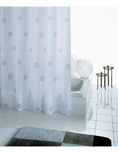Dette hvide badeforhæng er produceret i tekstil udsmykket med spiraler, og det fremstår dekorativt og elegant på badeværelset. Badeforhænget er lavet af 100% polyester, der er vandafvisende og derfor praktisk at bruge i brusebadet eller karbadet. Der er syet et bånd ind nederst på badeforhænget, således at det falder pænt og er behageligt at bruge i badet. Forhænget er nemt at montere, da det er udstyret med huller til ophæng på bøjlestang. Her kan der med fordel tilkøbes badeforhængsringe. Derudover kan badeforhænget vaskes i vaskemaskinen ved op til 60 grader, og det kan herefter stryges ved lave temperaturer.