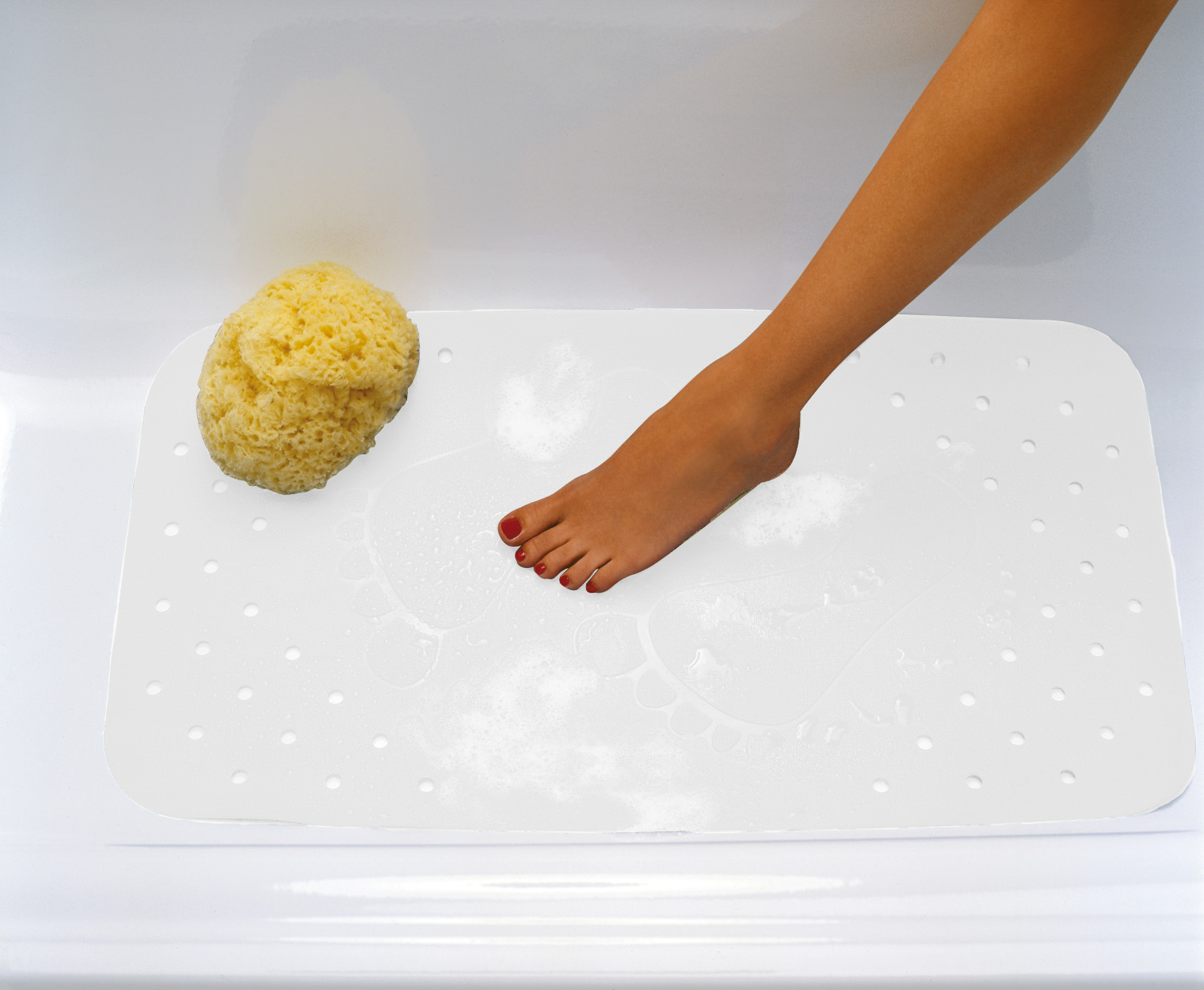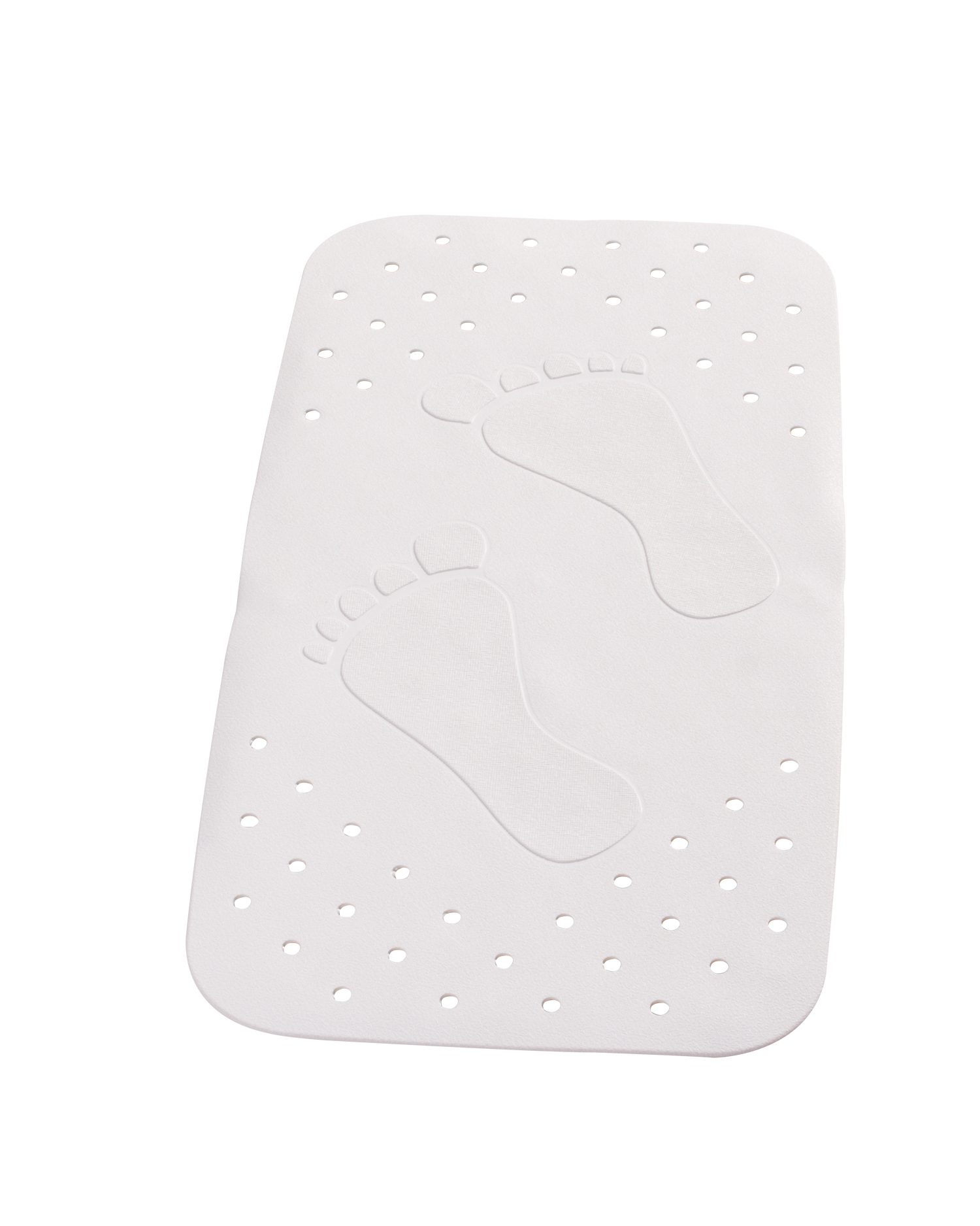 En skridsikker måtte til badekarret eller brusekabinen skærper sikkerheden, da man undgår at glide. Måtten er fremstillet af gummi, der giver et bedre greb og støtte. Bademåtten er hvid og har en rektangulær form med et motiv af to fødder. Den skridsikre måtte er praktisk og nem at rengøre med en fugtig klud.