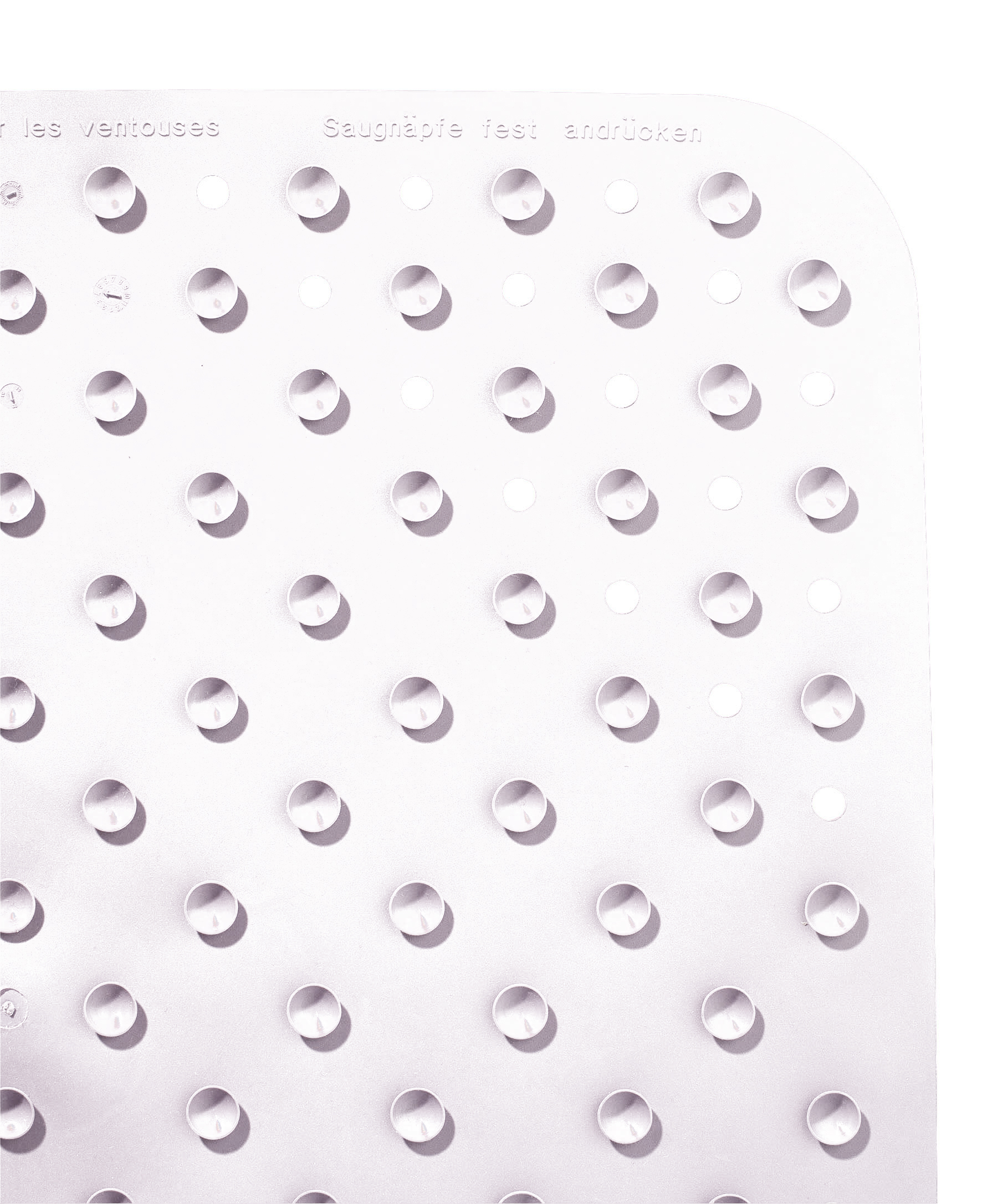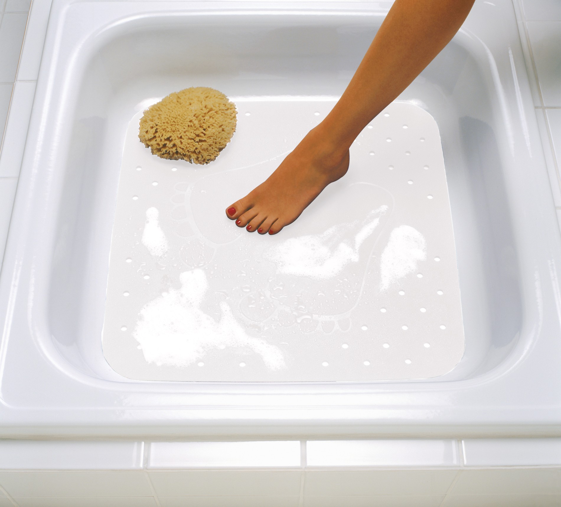 En skridsikker måtte til badekarret eller brusekabinen skærper sikkerheden, da man undgår at glide. Måtten er fremstillet af gummi, der giver et bedre greb og støtte. Bademåtten er hvid og har en kvadratisk form med et motiv af to fødder. Den skridsikre måtte er praktisk og nem at rengøre med en fugtig klud.