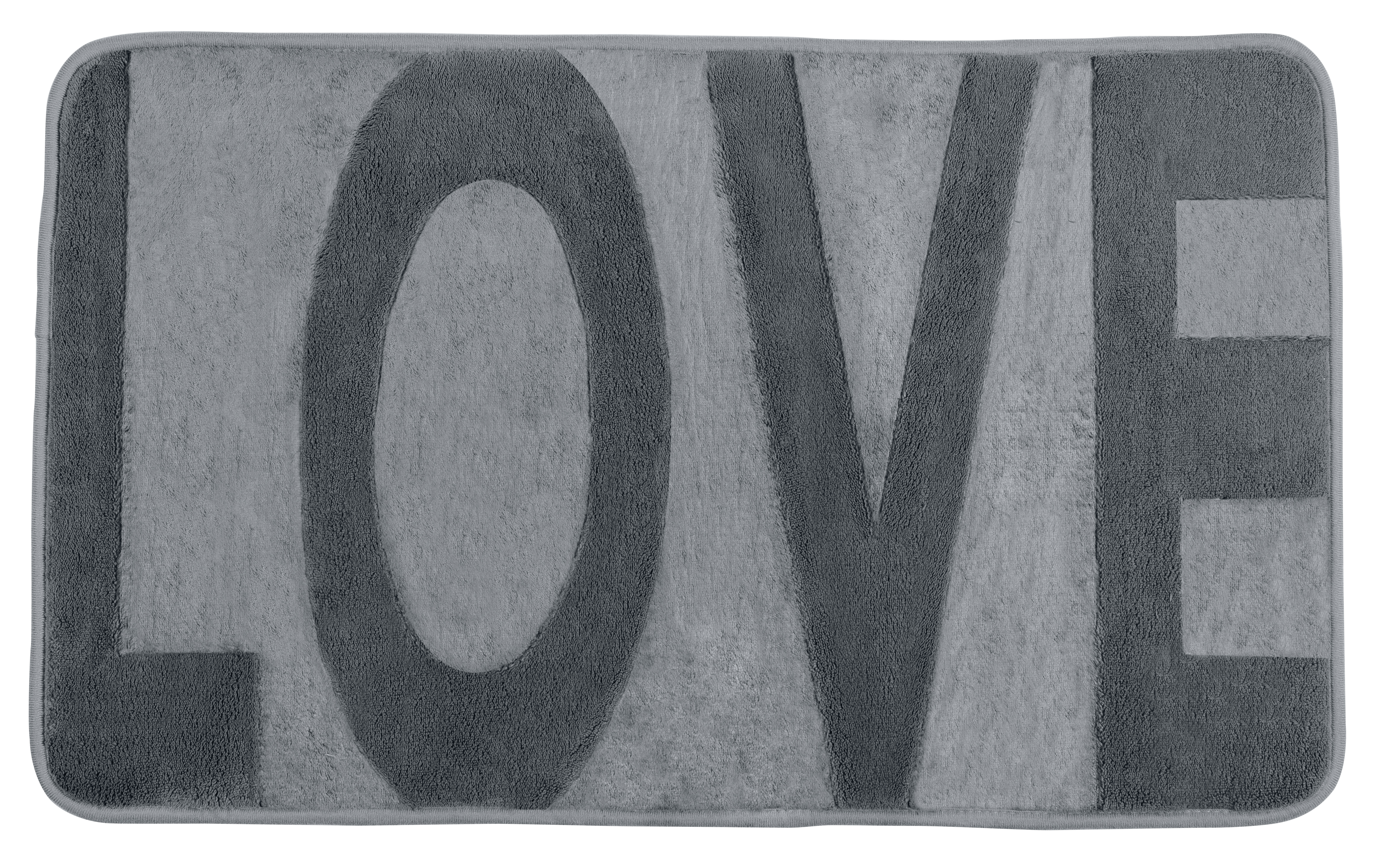 Dekorativ, fluffy bade måtte i grå med "Love" tekst. Den har en højfloret, tung overflade lavet af 100 % polyester. Måtten har en skridsikker belægning på bagsiden og er ideel til badeværelset og gæstetoilettet. Målene er 50 cm i bredden og 80 cm i højden.