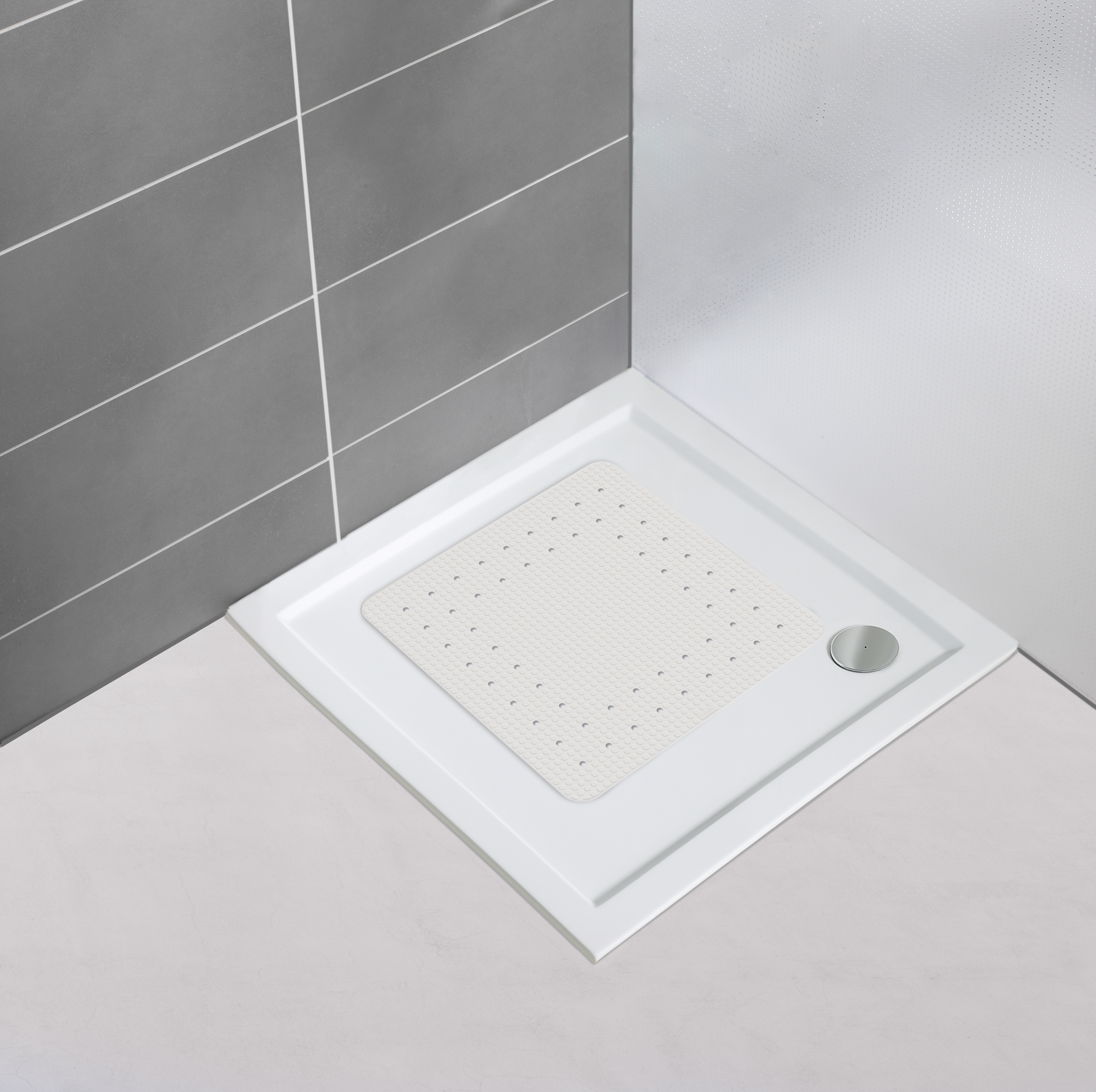 Skab en kombination af elegance og tryghed i badeværelset med den funktionelle og stilrene bademåtte Mirasol i hvid. Den klassiske farve og det dekorative hulmønster passer perfekt ind i moderne indretninger. Hårde, glatte overflader i brusenichen kan hurtigt blive glatte og farlige i kontakt med vand og sæbe – men Mirasol-måtten giver en skridsikker overflade, der forebygger uheld og sikrer et stabilt fodfæste. Den hudvenlige struktur er behagelig at stå på, og de mange sugekopper på undersiden sørger for, at måtten ligger fast uden at skride. Fremstillet af miljøvenlig og slidstærk kautsjuk og måler 54 x 54 cm – en praktisk størrelse, der passer til de fleste standard brusekar. Ønsker du et ensartet udtryk i badeværelset, fås også den matchende badekarsmåtte Mirasol i målene 69 x 39 cm.