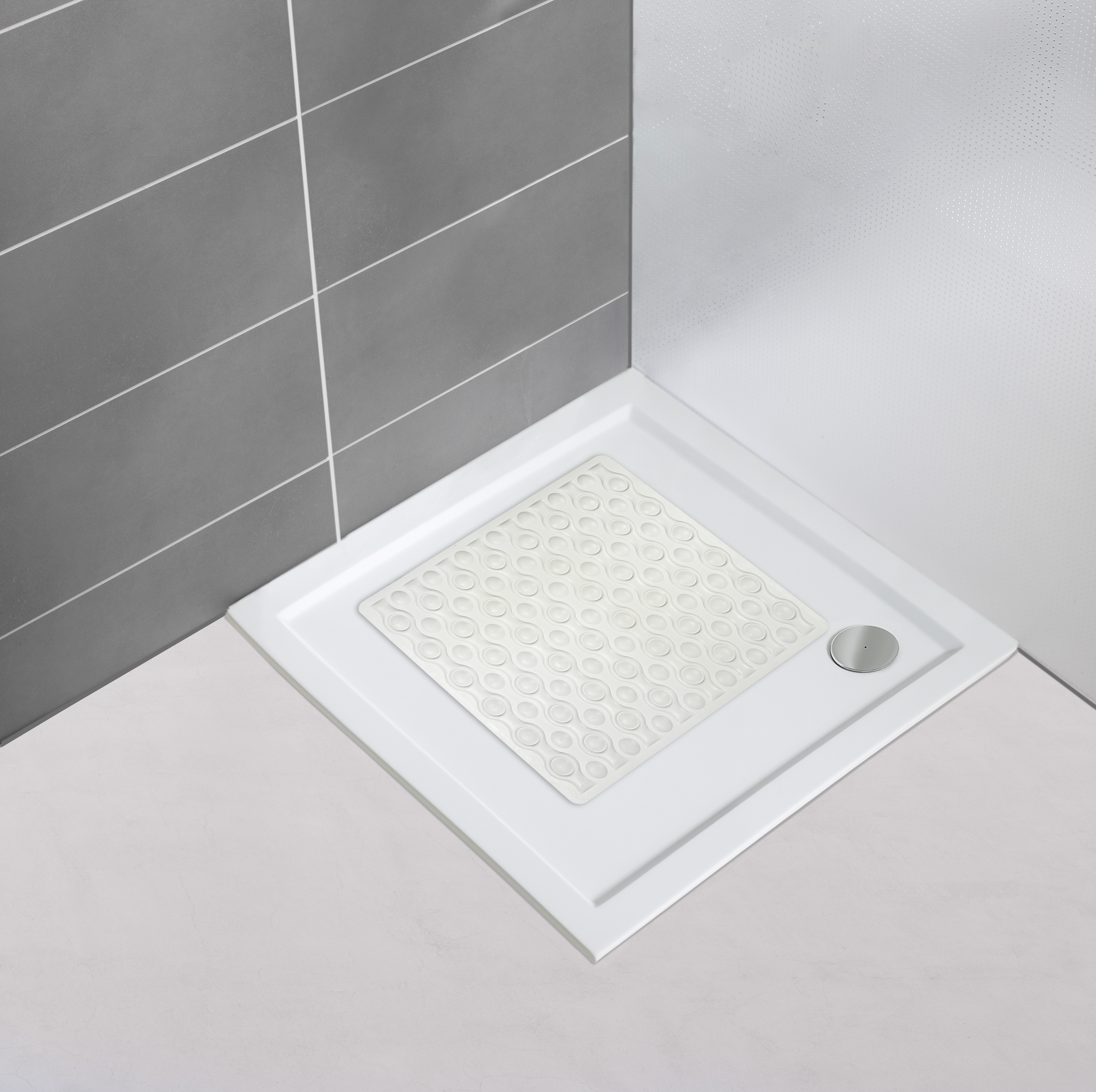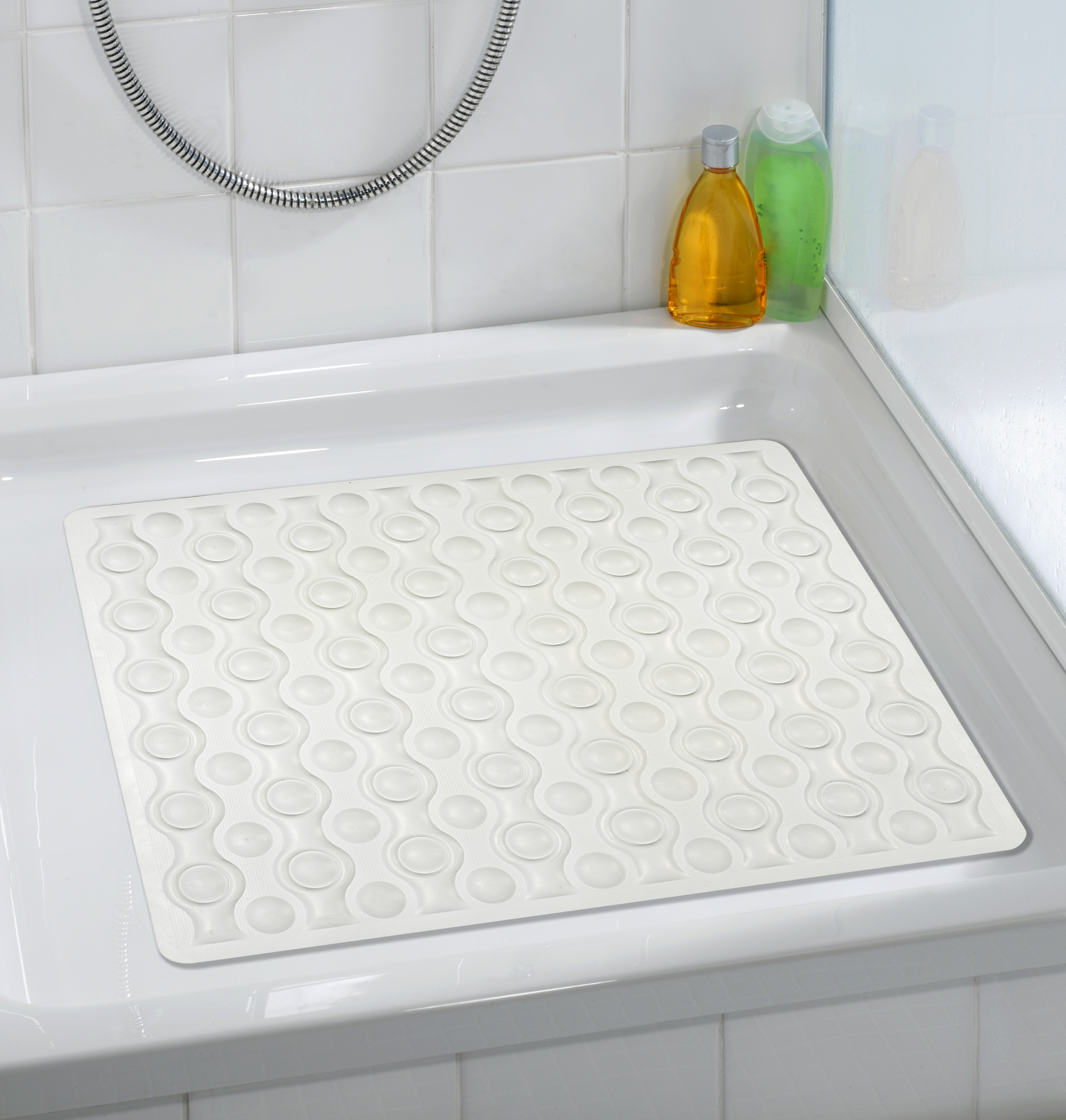 Denne dekorative og pålidelige brusemåtte i diskret hvid giver ekstra sikkerhed i brusekabinen. Den er udstyret med ekstra sugekopper på undersiden for et sikkert greb, og den hudvenlige skridsikre struktur sørger for maksimal sikkerhed.