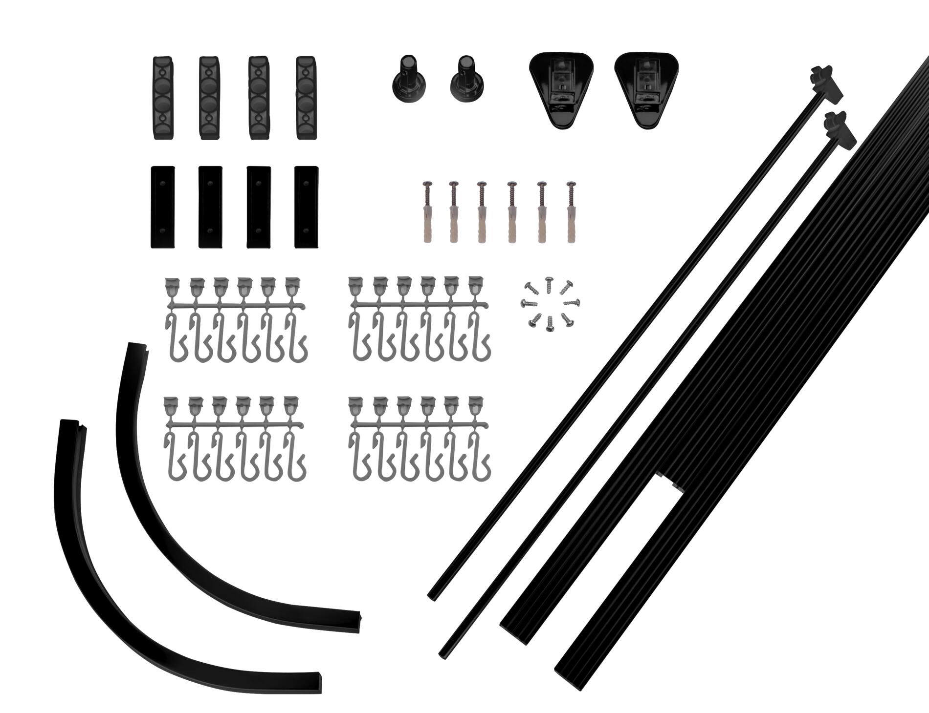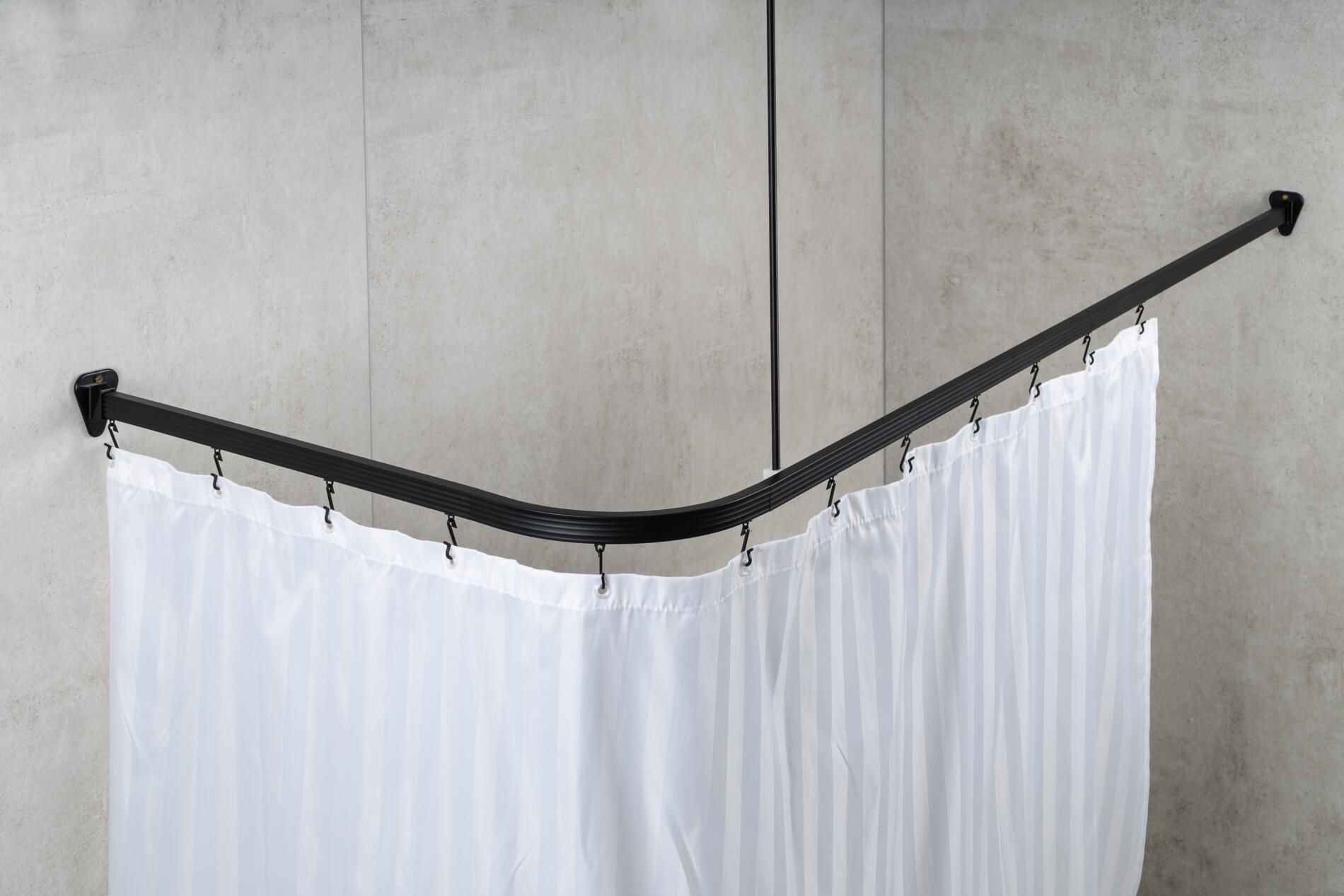 Røret kan nemt afkortes, hvis det er nødvendigt, og den indeholder indvendige plastglidere for ekstra funktionalitet. Plastik bruseforhængskroge (24 stykker) samt loftstøtter (2 stykker – ca. 51 cm) medfølger. Yderligere bruseforhængsringe er ikke nødvendige for brug.