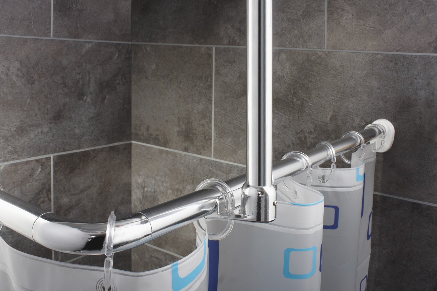 Ridder forhængsstang i krom med en diameter på 25 mm, designet til montering i hjørner. Stangen er både stilren og funktionel, ideel til badeværelser med behov for pladsbesparende løsninger. Bemærk, at loftstøtte ikke medfølger.