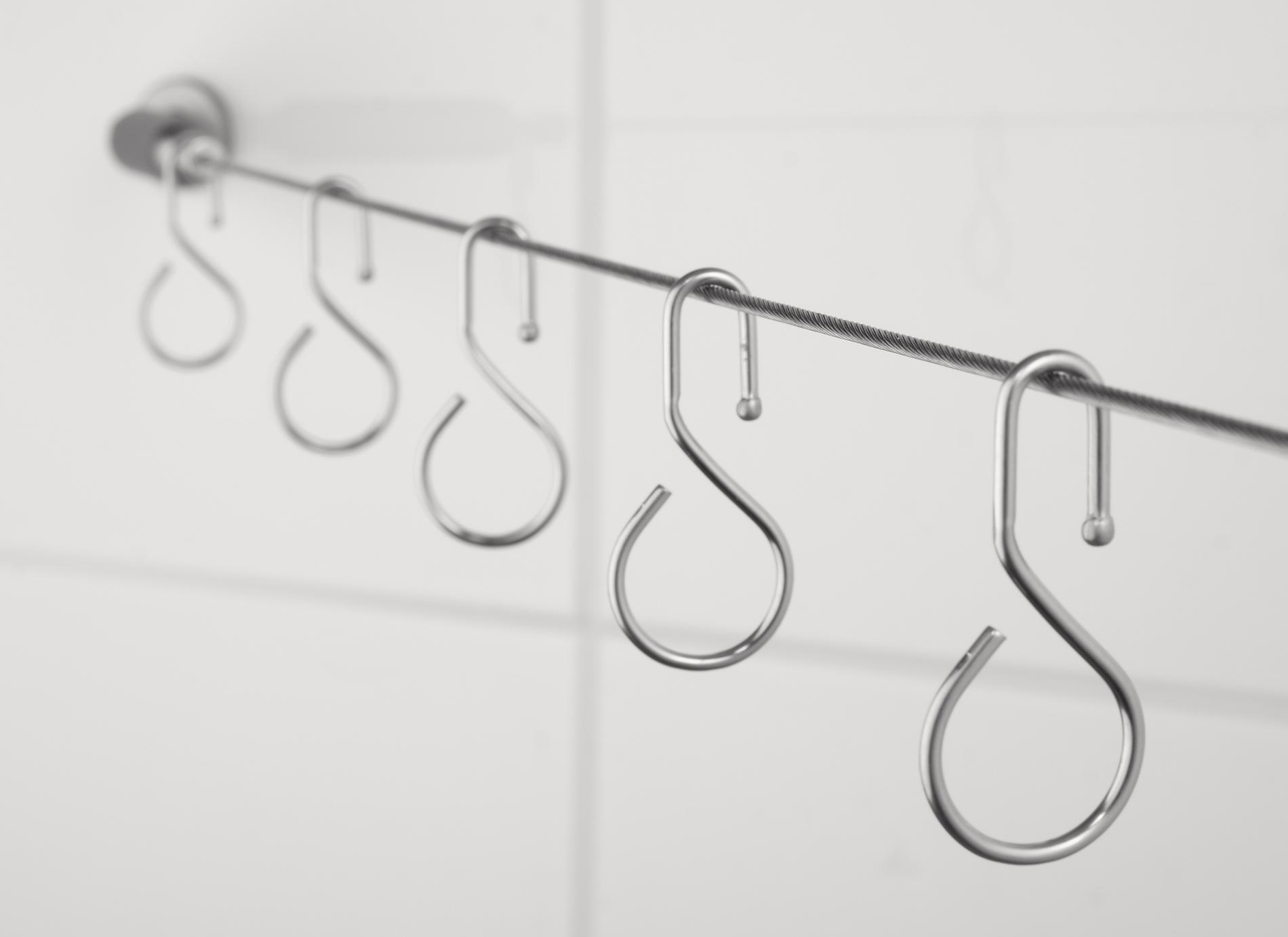 Med Ridder snorestrammesæt kan du nemt ophænge både bruseforhæng og lette gardiner uden behov for en bred eller markant stang eller skinne. Det rustfri ståltov er modstandsdygtigt over for rust, selv i fugtige miljøer som badeværelser, og passer perfekt ind i enhver indretning. Sættet kommer i en flot kromfarve og er fremstillet af rustfrit stål til spændetovet og messing til vægbeslagene.
