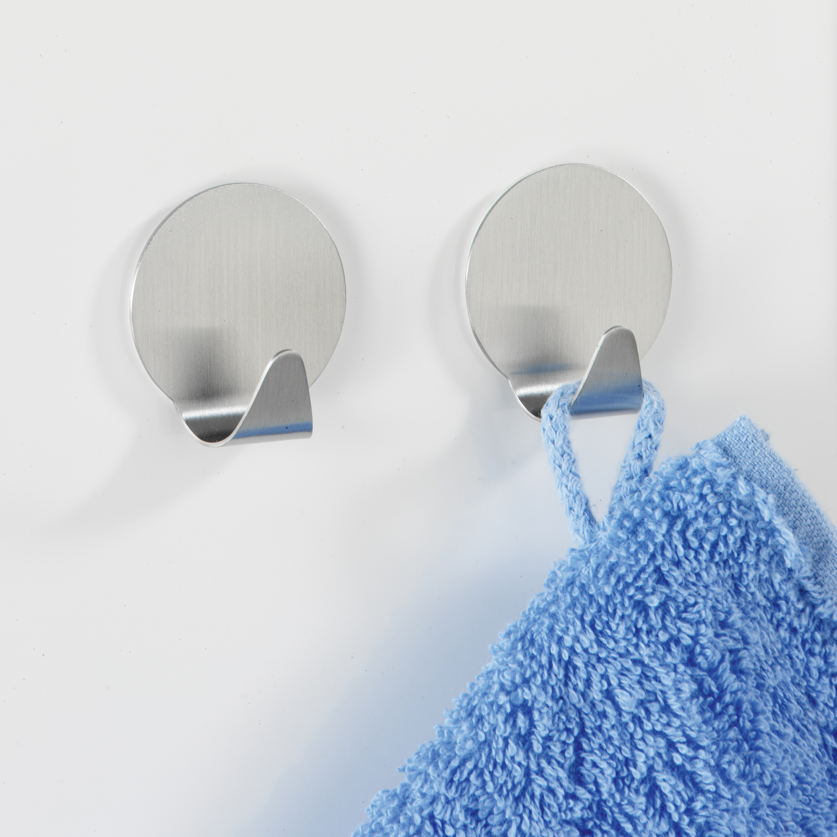 Dette krogesæt består af to runde kroge i et enkelt og stilrent design i mat rustfrit stål. De udgør en simpel og praktisk opbevaringsplads til mindre opbevaringsbehov i hjemmet. Krogene monteres på væggen ved brug af det selvklæbende materiale på krogenes bagside, og monteringen kræver derfor ingen boring i væggen.