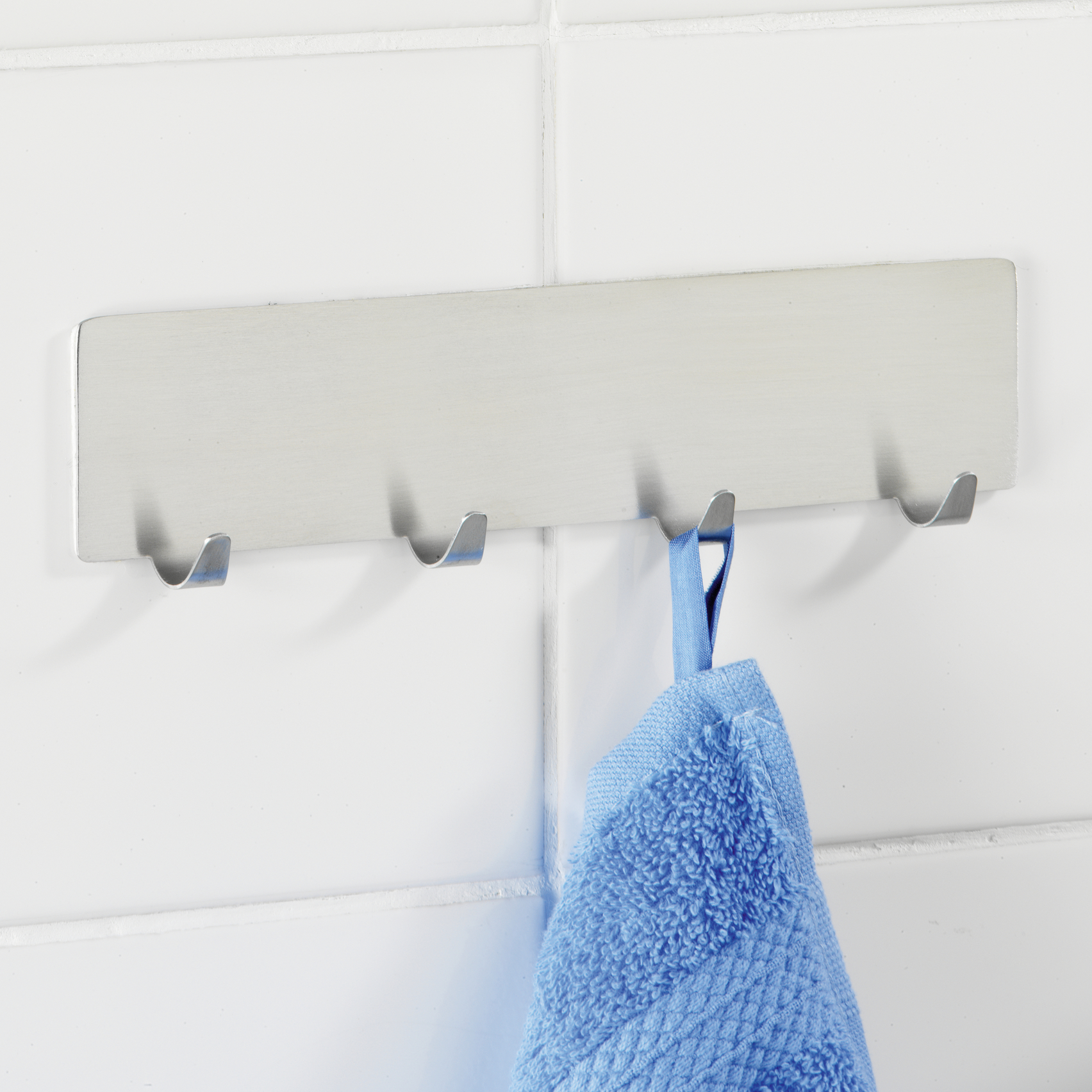 Wenko Esperia kroglisten i mat rustfrit stål med 4 kroge er en elegant og praktisk løsning til hjem med flere brugere. Den rektangulære liste med bløde, afrundede hjørner hjælper med at holde orden, så håndklæder, vaskeklude og badehåndklæder altid har en fast plads. Monteres nemt uden værktøj – fjern blot beskyttelsesfilmen og sæt den op, hvor du ønsker det. Kan fjernes igen uden at efterlade mærker eller skade overfladen.