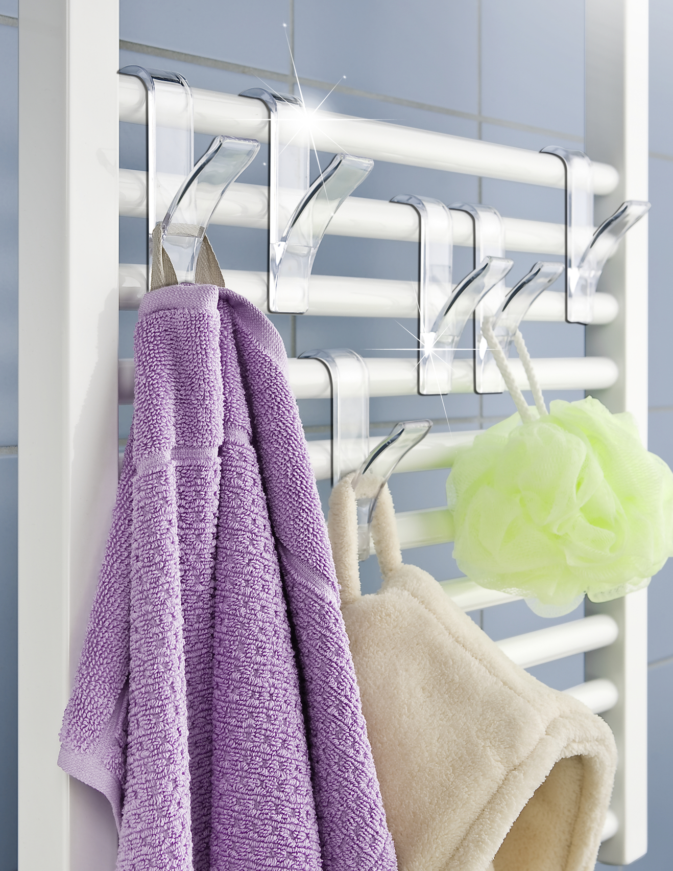 Krog til badeværelsesradiator, sæt med 2. Krogene er lavet af transparent plastik og er praktiske samt pladsbesparende. De hjælper med at holde din radiator ryddelig. Målene er 2,5 cm i bredden, 10,5 cm i højden og 7 cm i dybden hver.