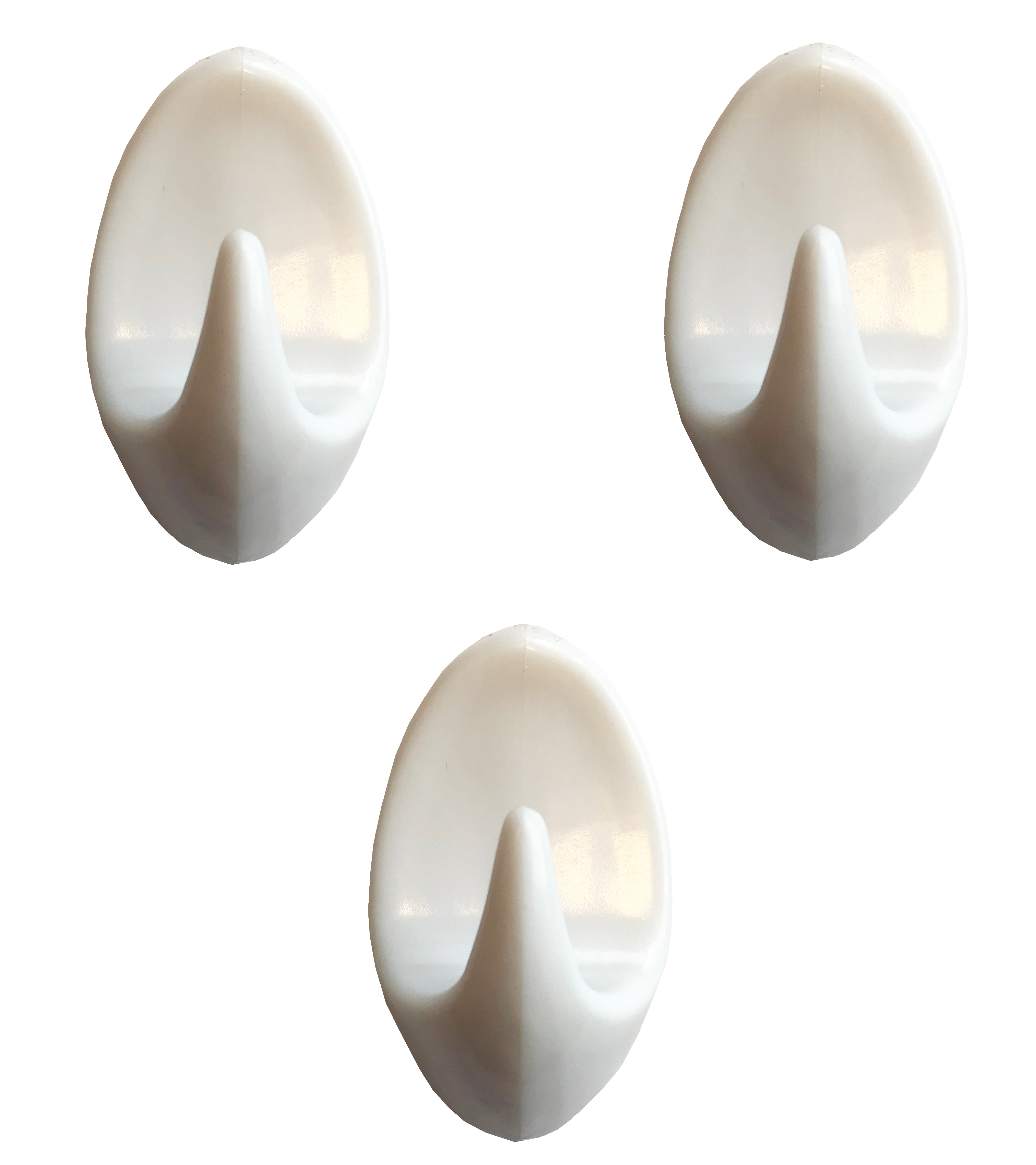 Sæt med 3 vægkroge til optimal brug i badeværelset eller husholdningen. Høj kvalitet i et ovalt design. Lavet af hvid plastik. For montering fjernes blot beskyttelsesfilmen, og krogene klæbes på. Hver krog måler 2,5 cm i bredden, 4 cm i højden og 2 cm i dybden.