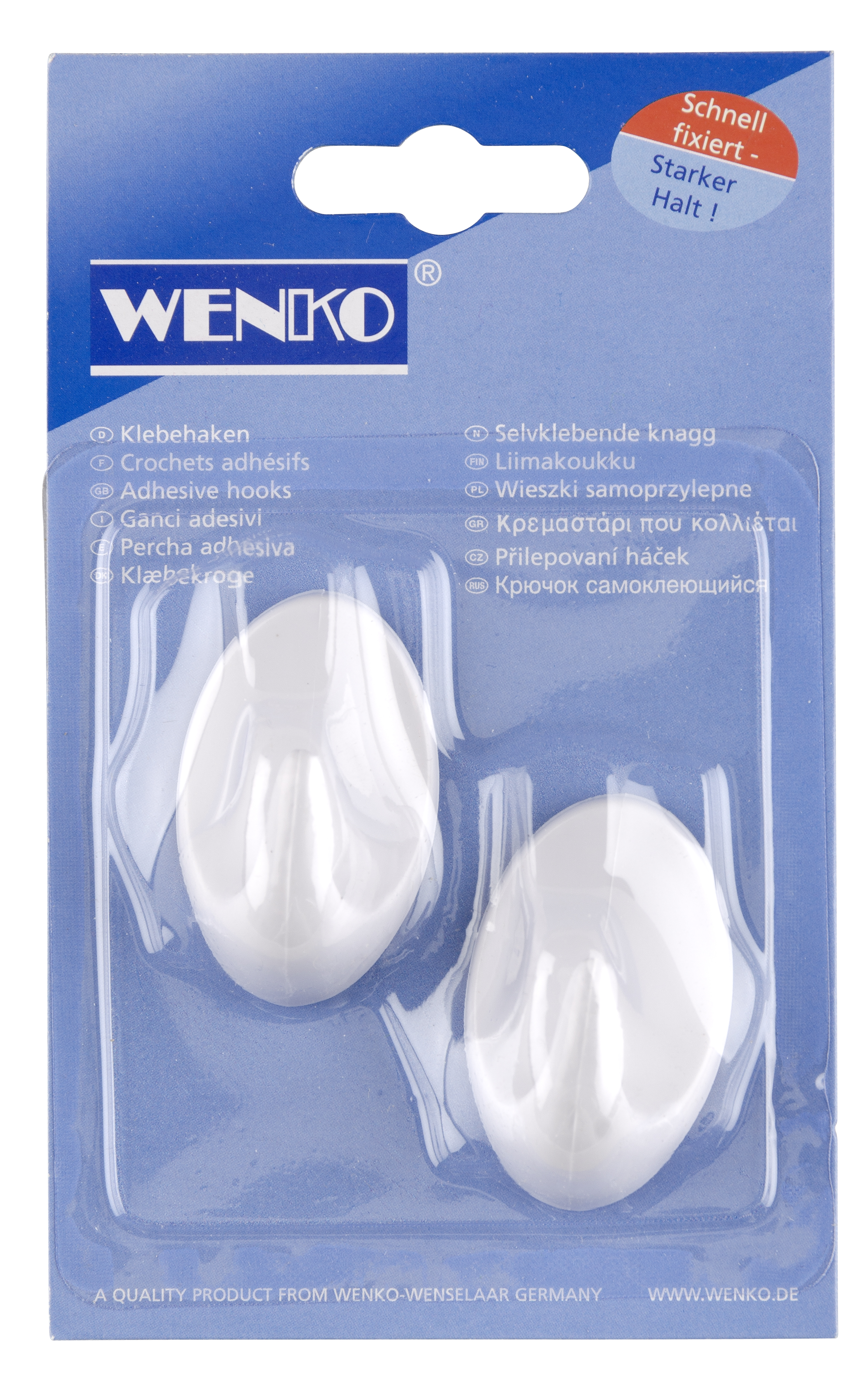 Sæt med 2 vægkroge til optimal brug i badeværelset eller husholdningen. Høj kvalitet i et ovalt design. Lavet af hvid plastik. For montering fjernes blot beskyttelsesfilmen, og krogene klæbes på. Hver krog måler 3 cm i bredden, 5 cm i højden og 2,5 cm i dybden.