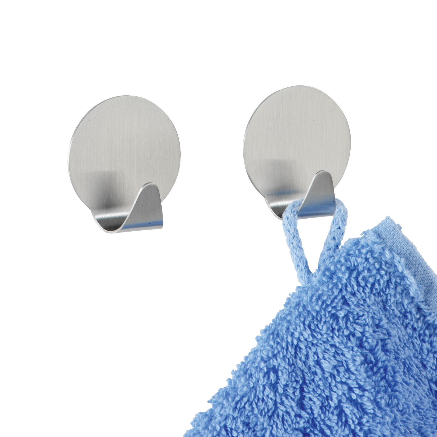 Disse vægkroge har et minimalistiske design med sine runde form og flade konstruktion. Krogesættet består af to kroge af mat rustfrit stål, der monteres nemt og hurtigt grundet krogenes strip-it-system. Krogene er udstyret med en selvklæbende bagside, der sikrer en nem installering uden boring.