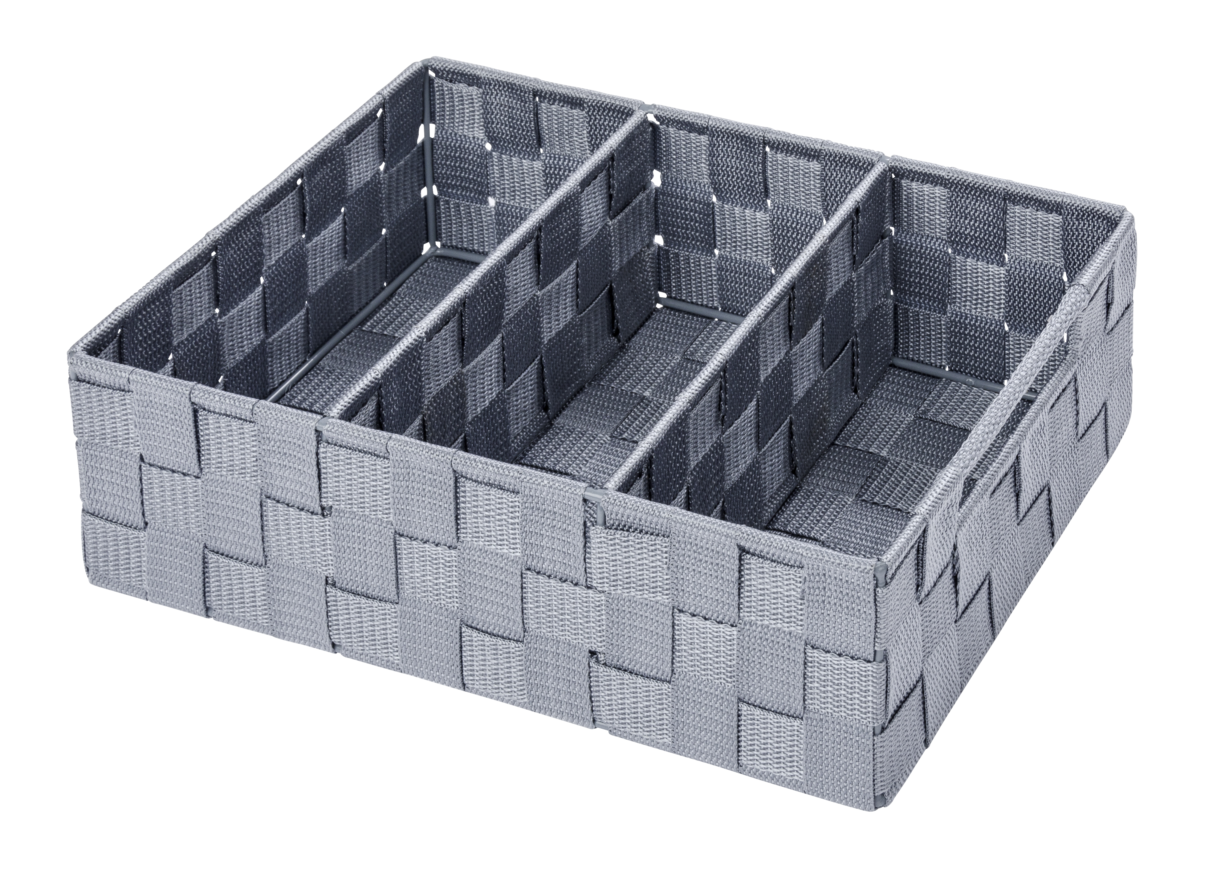 Opbevaringskurven fra WENKO er en smart og kompakt løsning til at holde styr på dine småting. Med tre separate rum og praktiske bæregreb i siderne er den ideel til opbevaring af alt fra makeup og toiletartikler til andre hverdagsgenstande. Den passer perfekt på badeværelset, i skabet eller på kommoden og hjælper dig med at holde orden med stil.