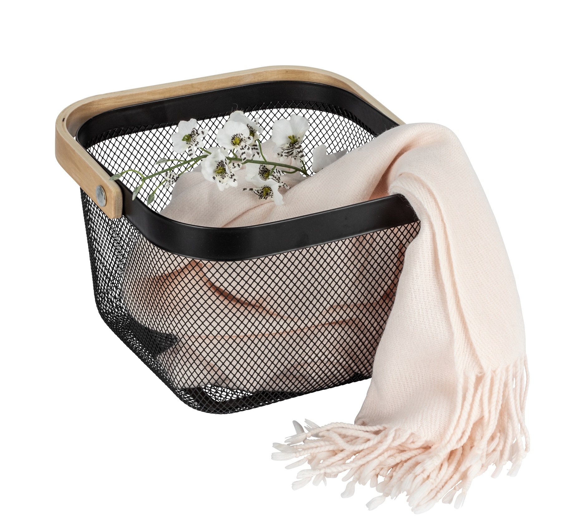 Elegant badeværelseskurv i trendy industrielt look. Ideel til opbevaring af redskaber i badeværelset og gæstetoilettet. Lavet af matlakeret sort stål med bambushåndtag. Kan kombineres med matchende møbler fra Bambusa-serien. Mål (B x H x D): 25 x 17 x 25 cm.