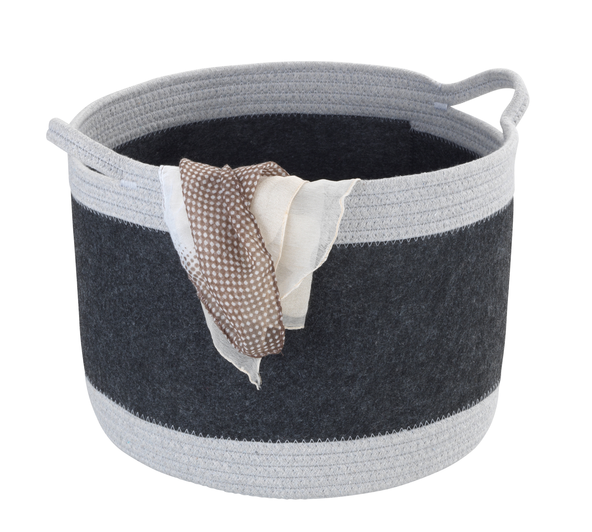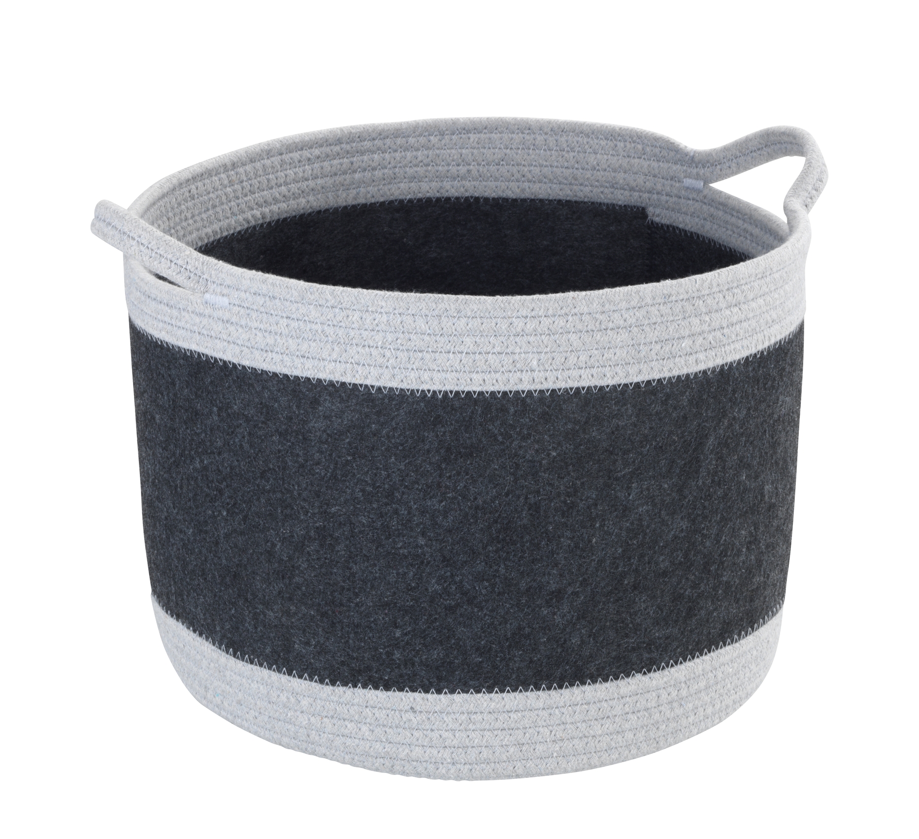 Opbevaringskurv lavet af genanvendt polyesterfilt i mørkegrå. Har et lysegråt vævet design og består af 80% polyester og 20% bomuld. Ideel til stue, soveværelse, badeværelse eller gæstetoilet. Udstyret med praktiske bærehåndtag for nem transport. Mål (B/D x H): Ø 35 x 26 cm, volumen: 30 liter.