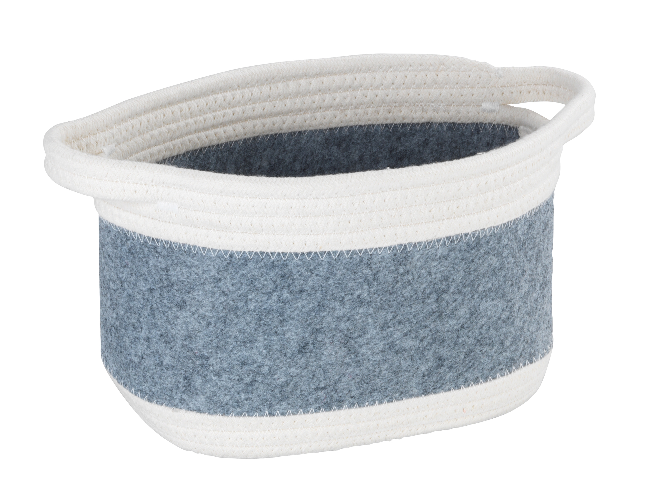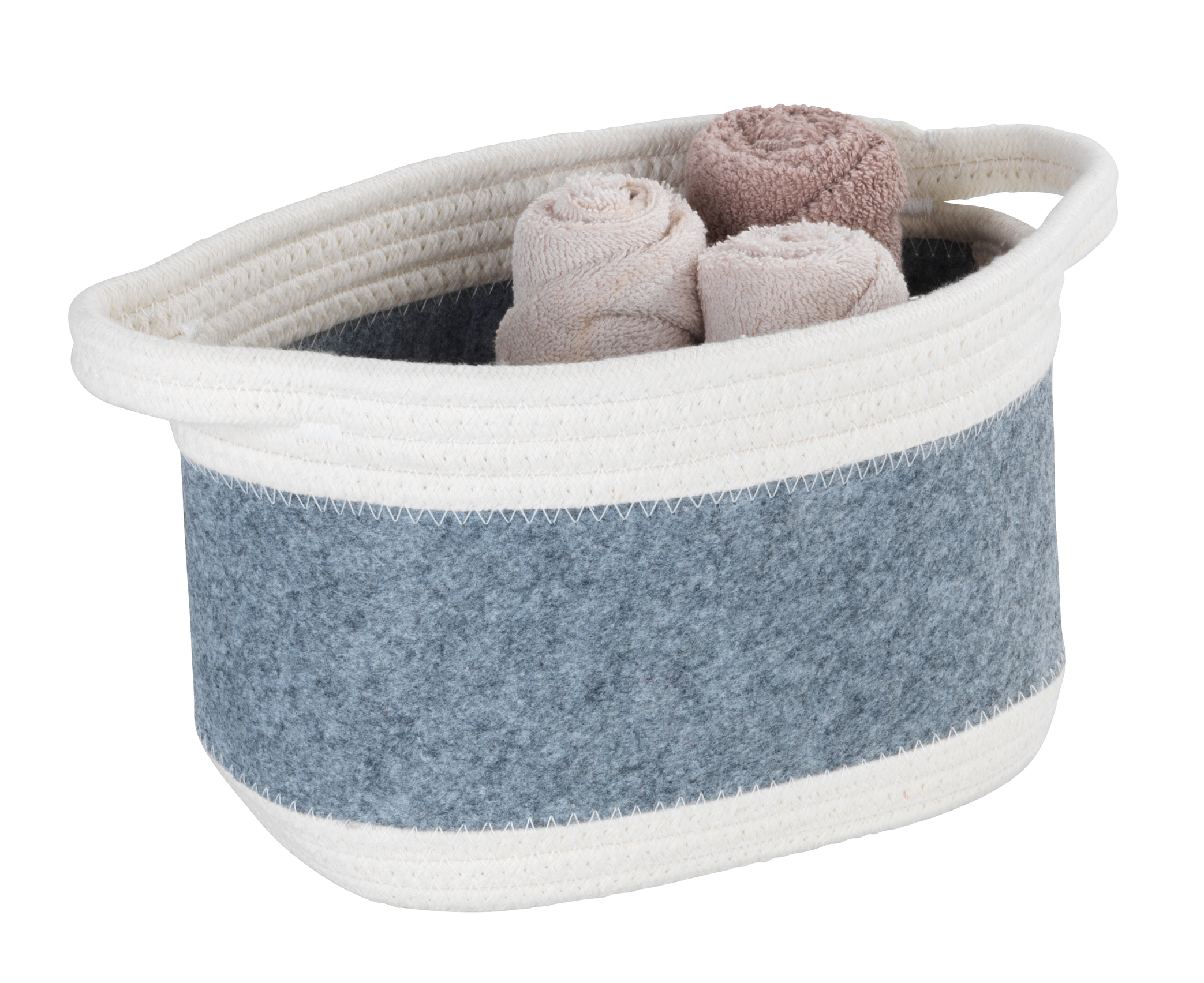Opbevaringskurv lavet af genanvendt polyesterfilt i lysegrå. Har et hvidt vævet design og består af 80% polyester og 20% bomuld. Ideel til stue, soveværelse, badeværelse eller gæstetoilet. Udstyret med praktiske bærehåndtag for nem transport. Mål (B x H x D): 24 x 16 x 16 cm, volumen: 5 liter.