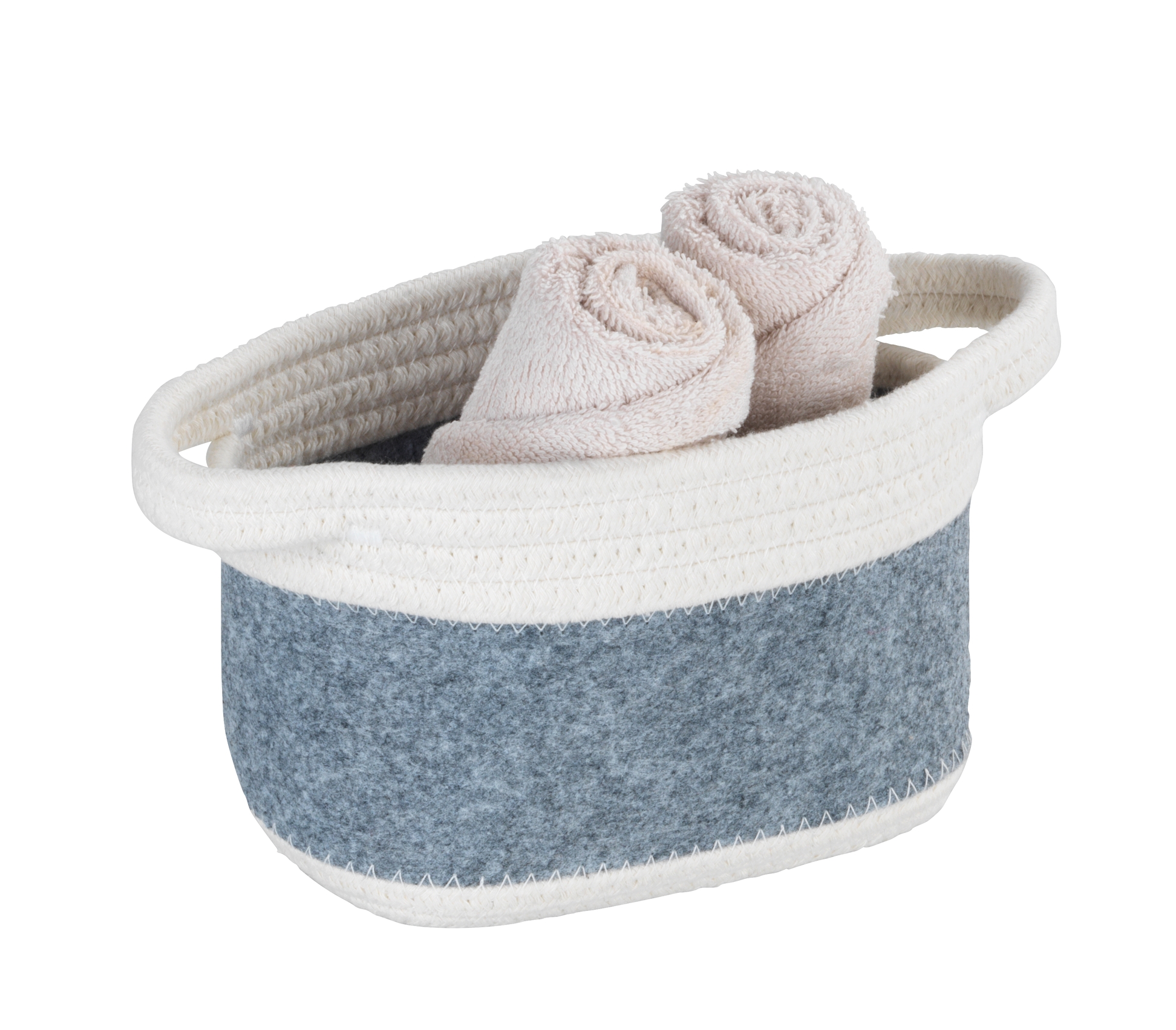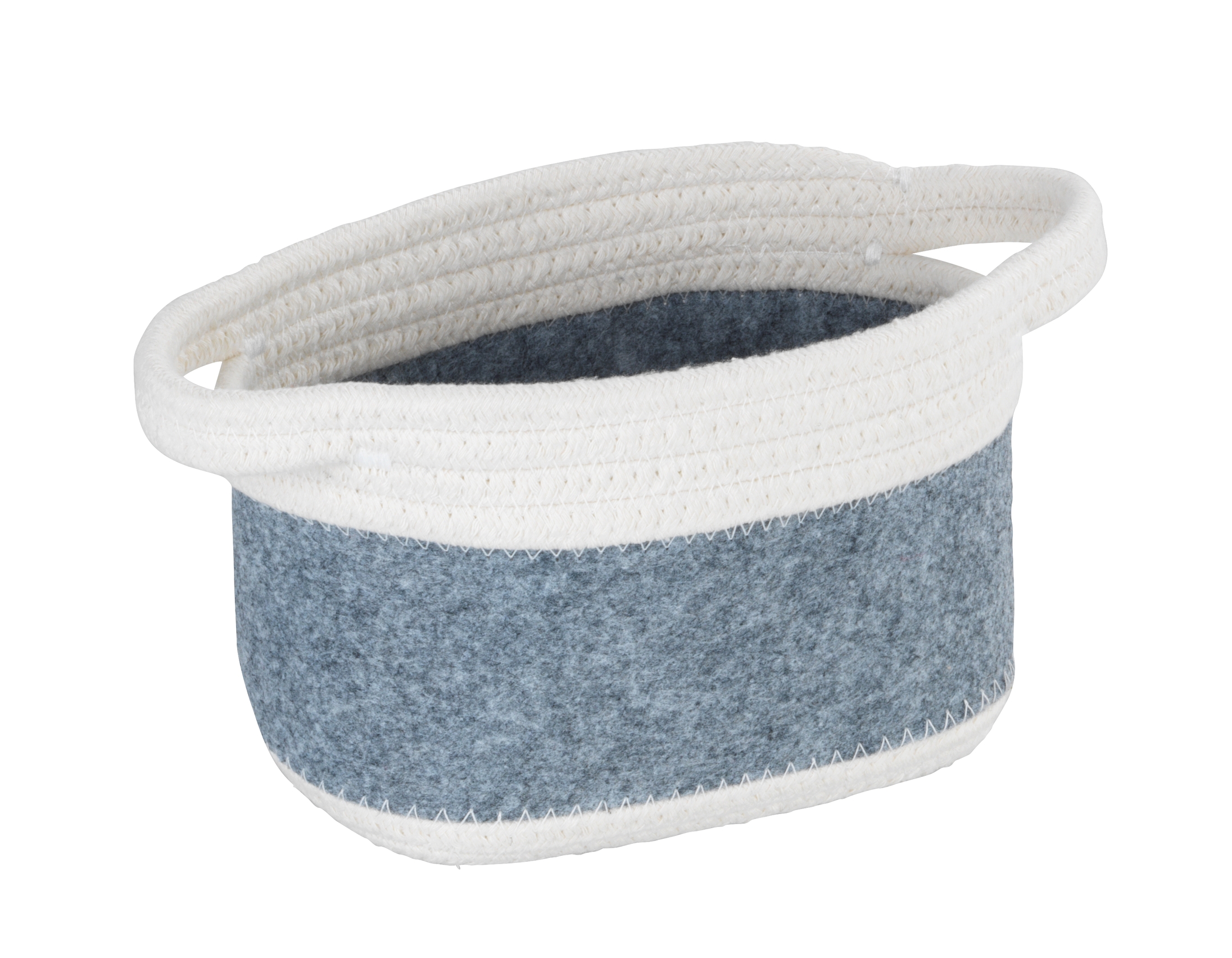 Opbevaringskurv lavet af genanvendt polyesterfilt i lysegrå. Har et hvidt vævet design og består af 80% polyester og 20% bomuld. Ideel til stue, soveværelse, badeværelse eller gæstetoilet. Udstyret med praktiske bærehåndtag for nem transport. Mål (B x H x D): 18 x 13 x 12 cm, volumen: 2,5 liter.