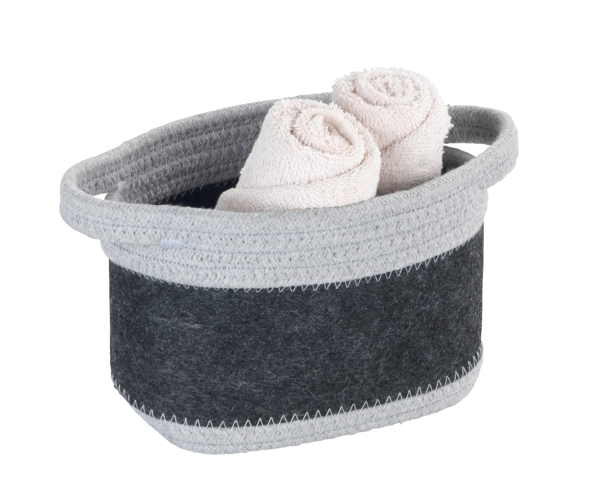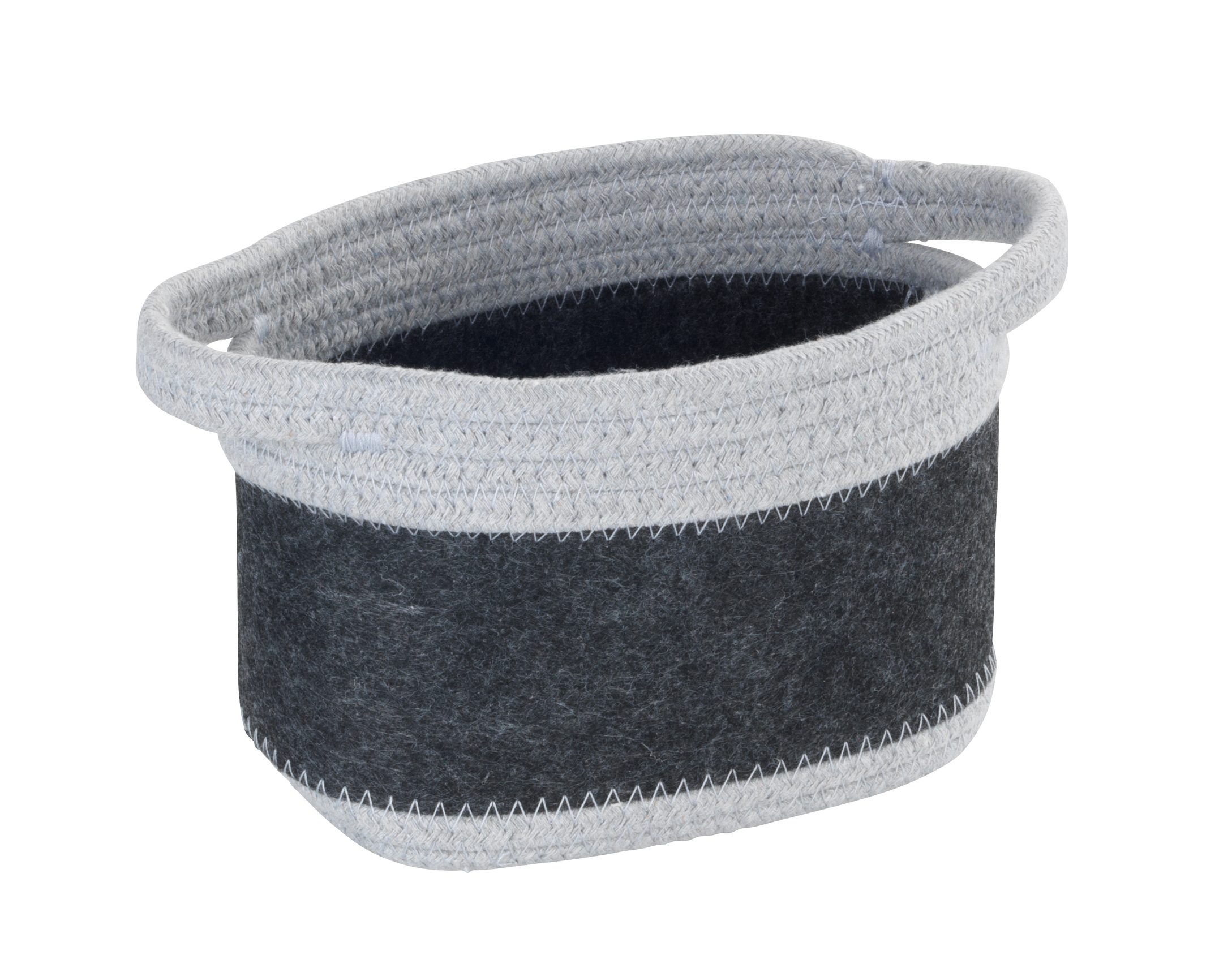 Opbevaringskurv lavet af genanvendt polyesterfilt i mørkegrå. Har et lysegråt vævet design og består af 80% polyester og 20% bomuld. Ideel til stue, soveværelse, badeværelse eller gæstetoilet. Udstyret med praktiske bærehåndtag for nem transport. Mål (B x H x D): 18 x 13 x 12 cm, volumen: 2,5 liter.