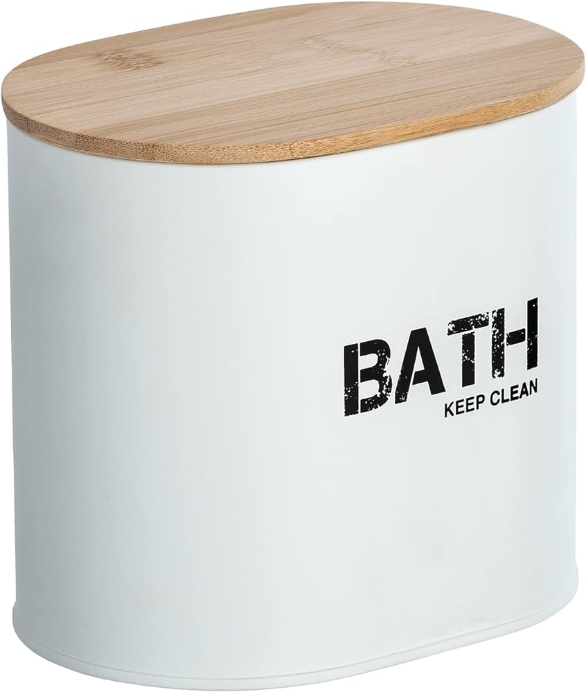Moderne opbevaringsboks til badeværelset, gæstetoilettet og hele husholdningen. Designet i en trendy industriel stil, kan kombineres med andre bokse fra Gara-serien. Med praktisk låg lavet af bæredygtig bambus. Fremstillet af stål i hvid med trendy print. Måler 14,5 cm i bredden, 13,5 cm i højden og 10,5 cm i dybden.