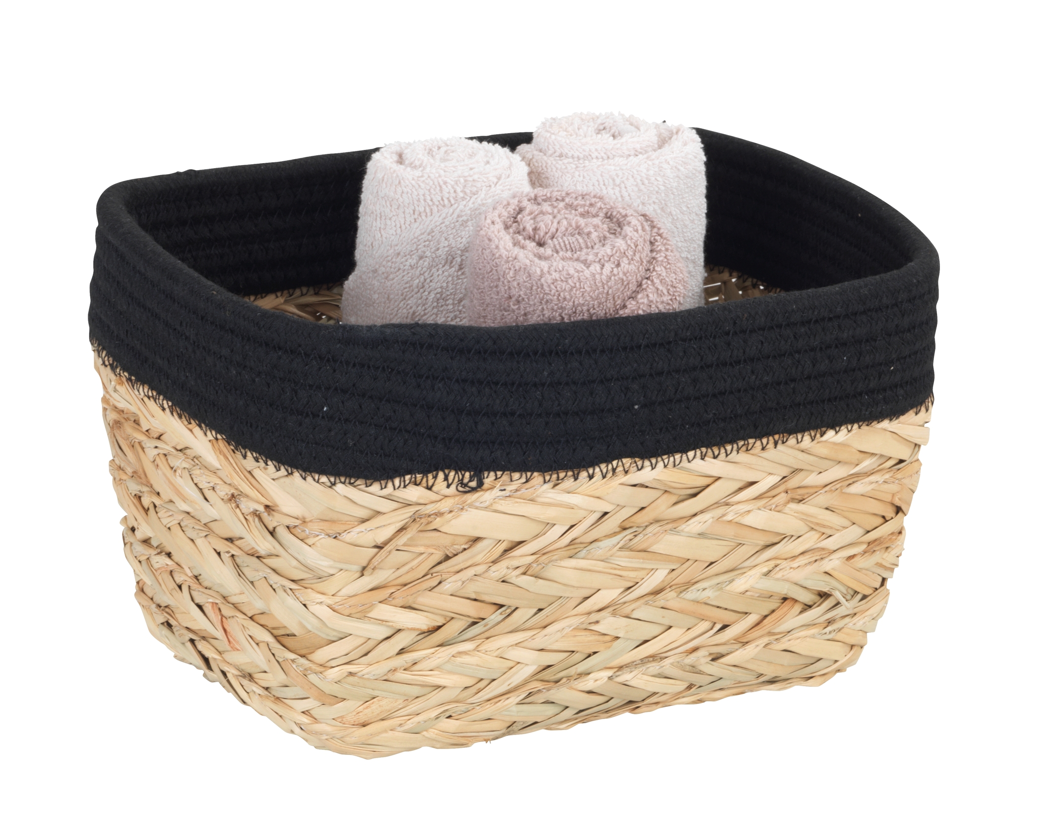 Denne attraktive opbevaringskurv, fremstillet af børstegræs, er ideel til opbevaring af kosmetik og gæstehåndklæder. Den fungerer som en praktisk organiser til køkkenet, badeværelset og soveværelset. Kurven er elegant kombineret med en sort stofkant og består af 80 % naturfibre og 20 % bomuld. Dens mål er 18 cm i bredden, 15 cm i højden og 25 cm i dybden.