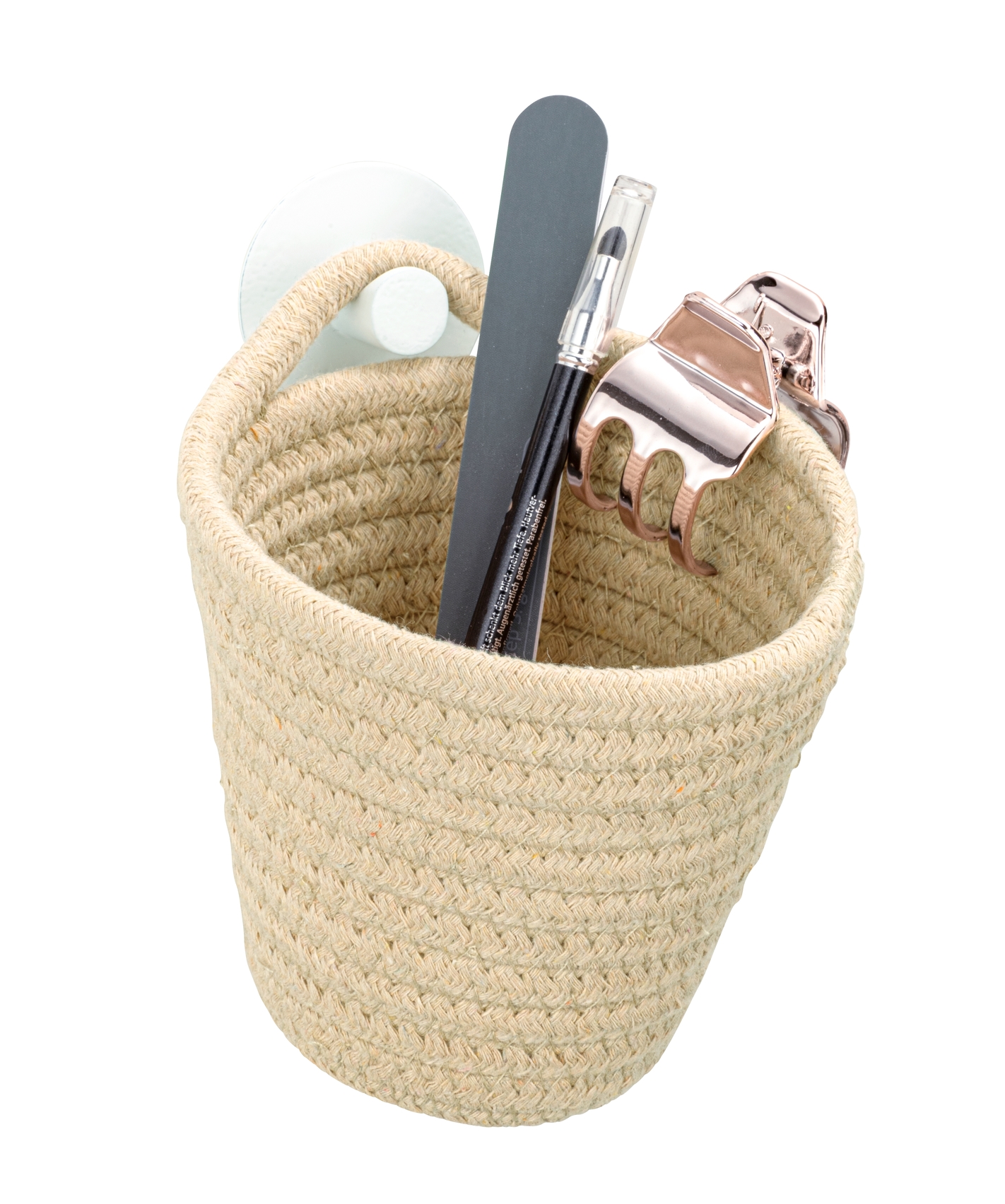 Denne opbevaringskurv med en praktisk løkke kan hænges op for at spare plads og er ideel til opbevaring af småting. Kurven er lavet af 60 % polyester og 40 % bomuld. Dens mål er 12,5 cm i bredden, 12 cm i højden og 14,5 cm i dybden.