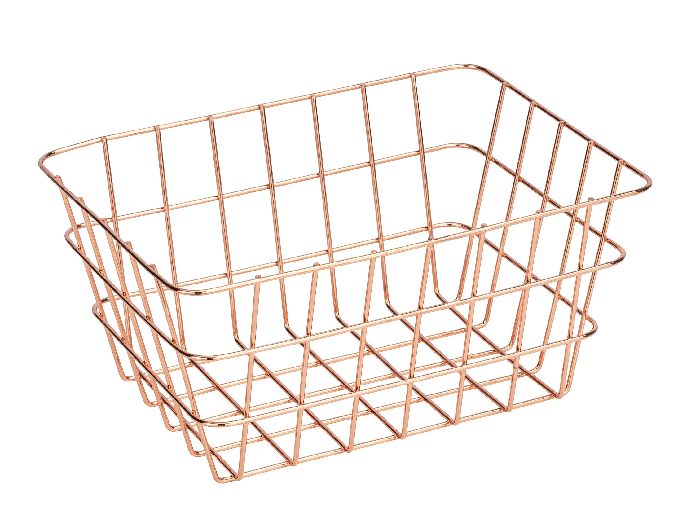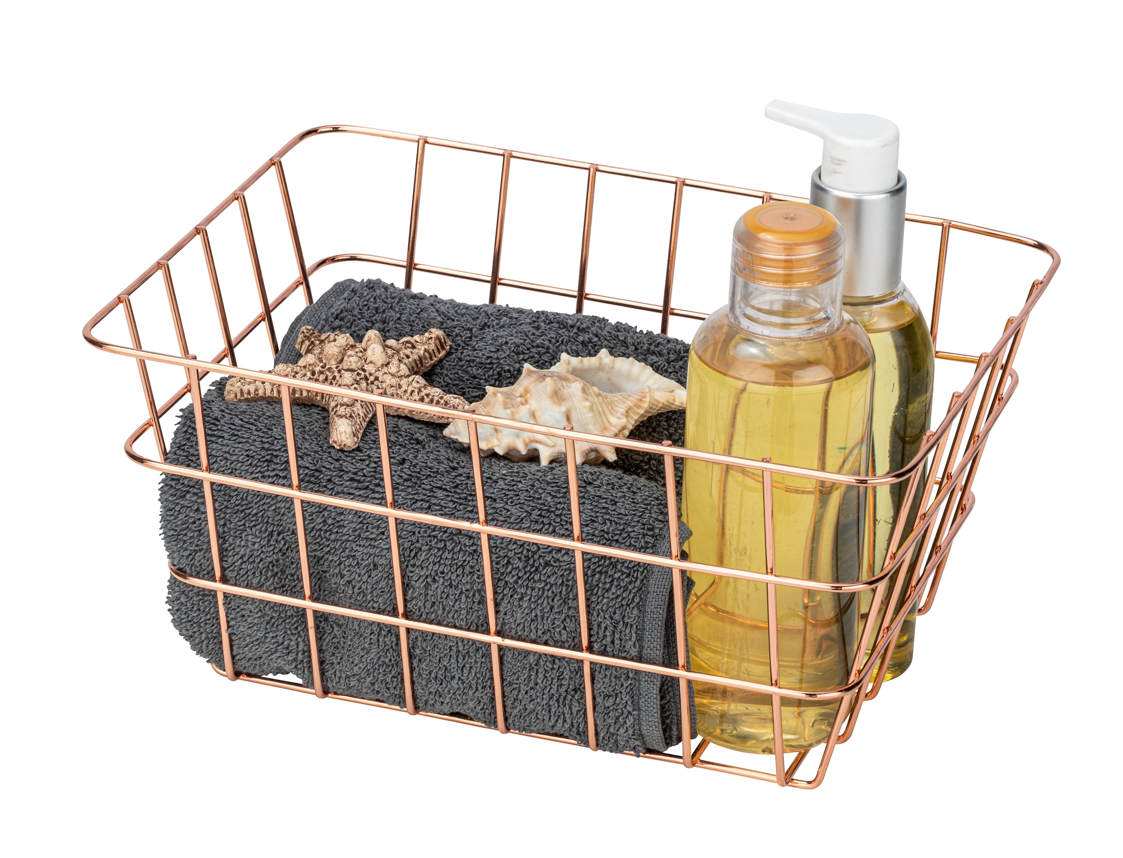 Denne trendy opbevaringskurv er perfekt til badeværelset, gæstetoilettet eller i hjemmet. Den er lavet af metal i kobber og har et moderne trådlook. Kurven er ideel til opbevaring af håndklæder, kosmetik, børster og lignende, men kan også bruges i stuen, køkkenet eller andre rum. Dens mål er 18 cm i bredden, 25 cm i højden og 12 cm i dybden.