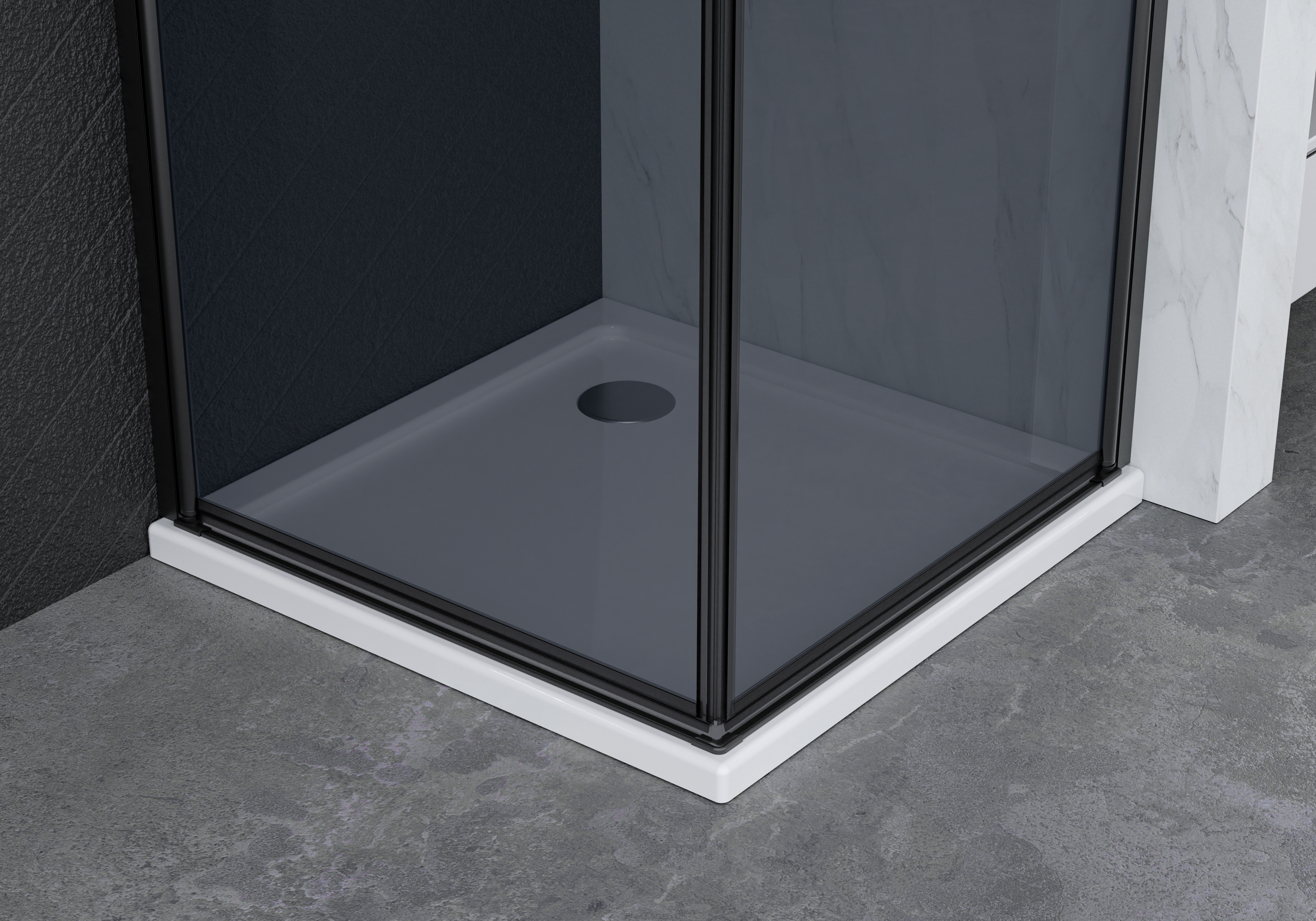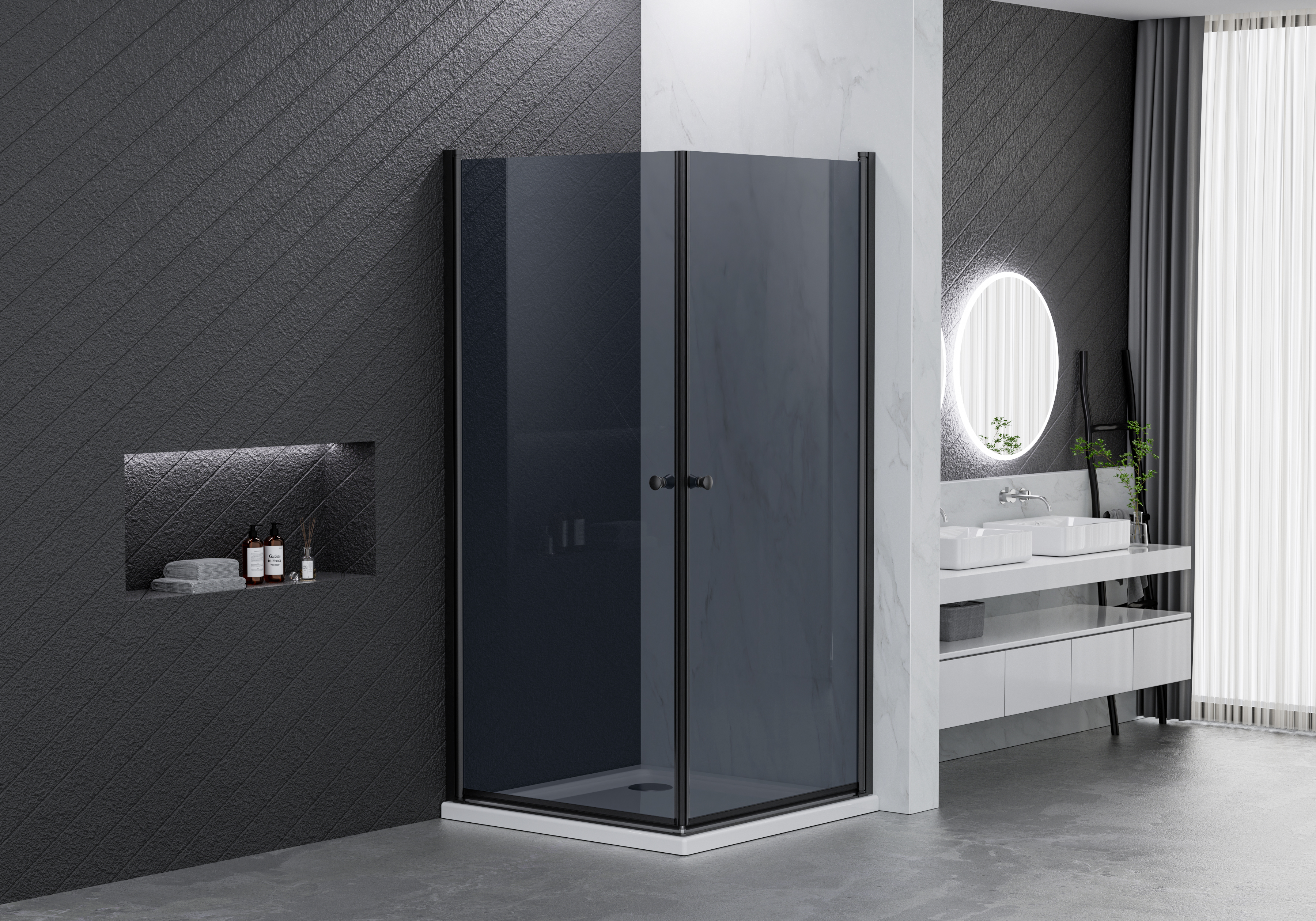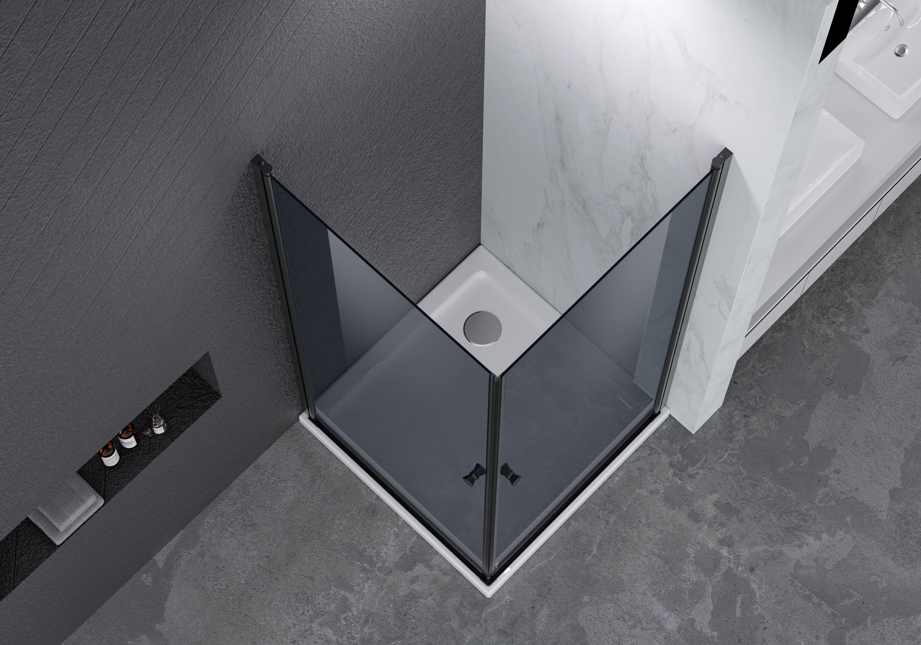 Dørene er udstyret med magnetlukning, og de er pladsbesparende, da de kan lukkes ind imod hinanden. På dørene sidder to håndtag i mat sort ABS, der matcher afskærmningens vægprofiler af mat sort aluminium.