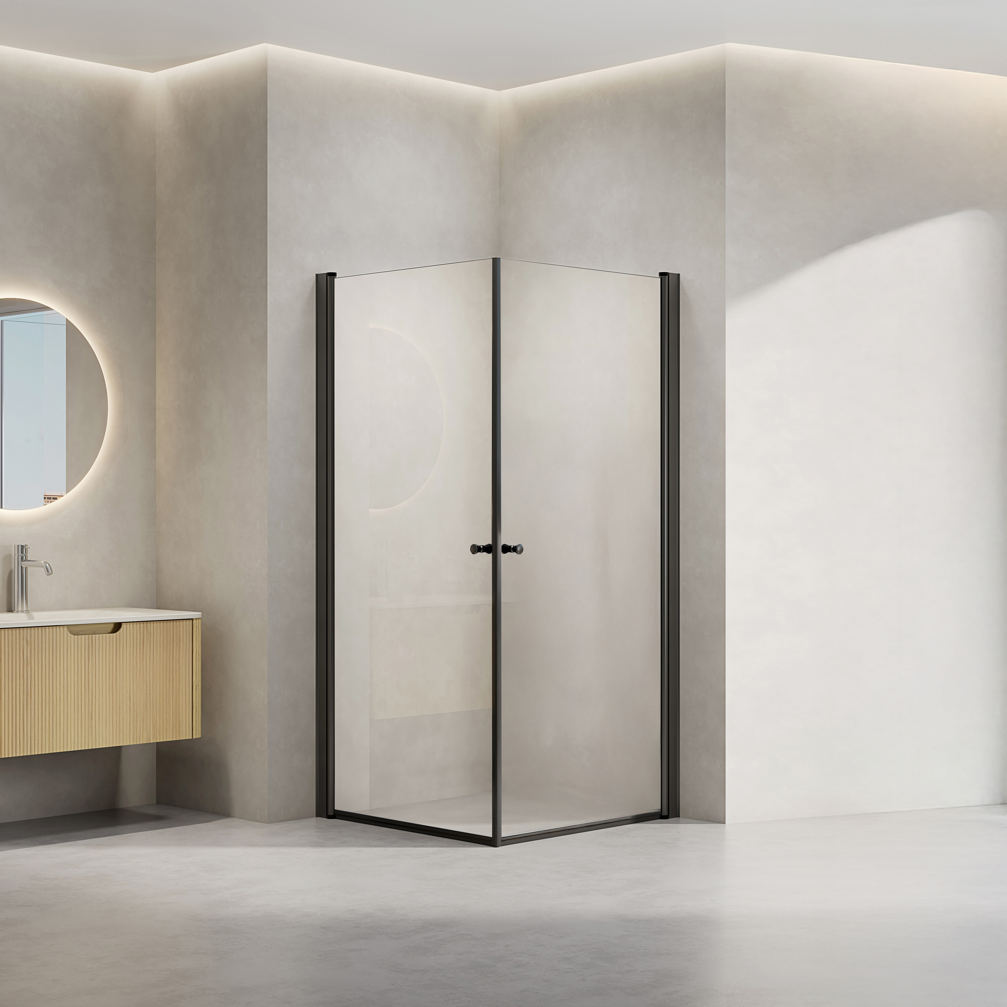 På dørene sidder to håndtag i krom ABS, vægprofilerne af aluminium. Glasset er i en stilet og klassisk klar udgave. Afskærmningen kan let aftørres efter bad, og den bør vedligeholdes jævnligt med neutrale rengøringsmidler uden syre- eller baseopløsninger.