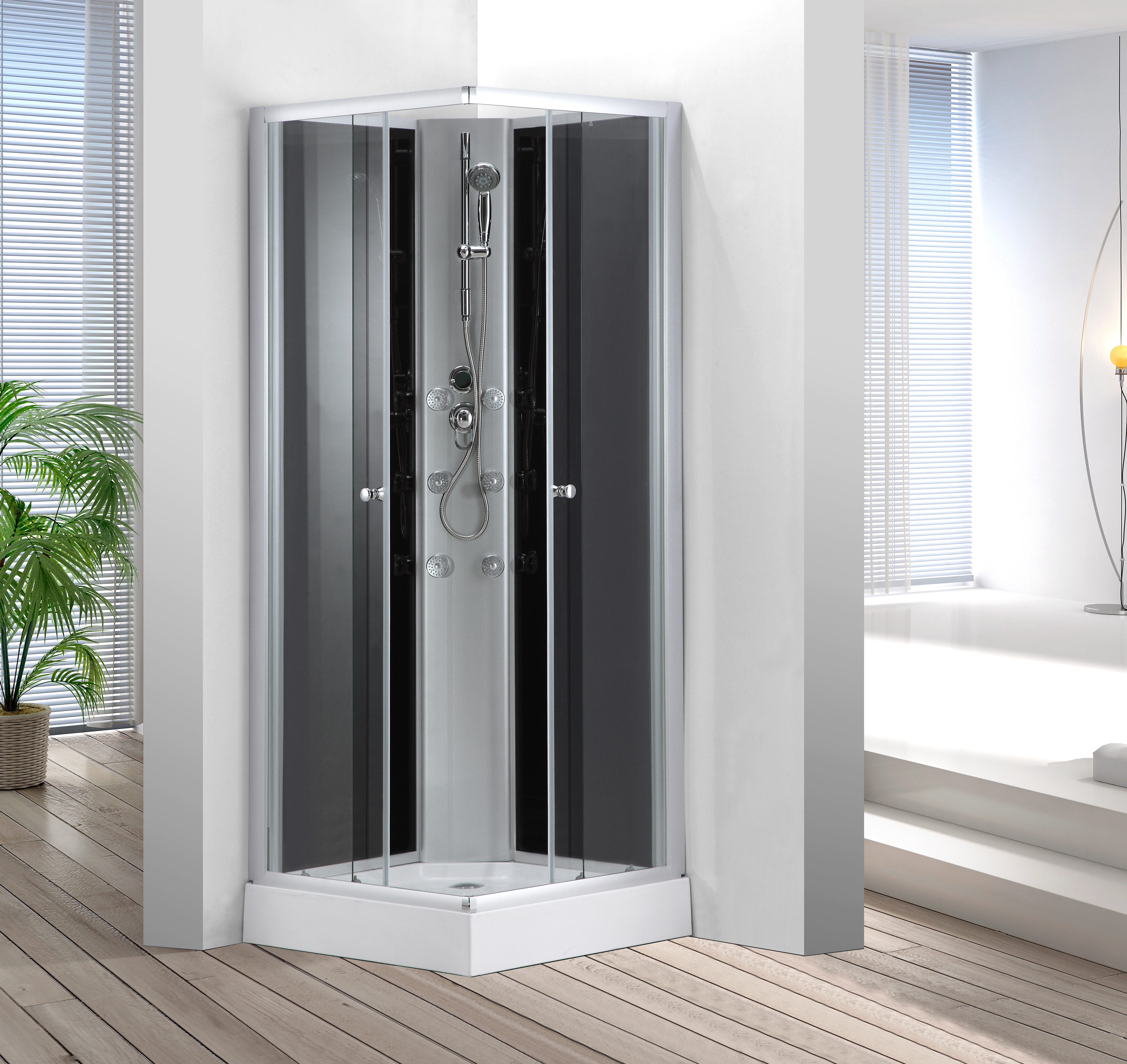 Skagen brusekabine er ideel for dig, der ønsker en komplet kabine på badeværelset. Kabinen placeres i et hjørne, hvor den firkantede model passer perfekt ind og flugter med væggene. Den er udstyret med 2 funktionelle rulledøre, hvorpå 2håndtag i krom er placeret. Dørene er af klart sikkerhedsglas med en tykkelse på 5 mm, og på kabinens bagside er der sort glas med en tykkelse på 4 mm. Den veludstyrede brusekabine rummer derudover et hvidt bundkar med afløb, og der er indbygget armatursystem med brusestang, bruseslange og håndbruser.