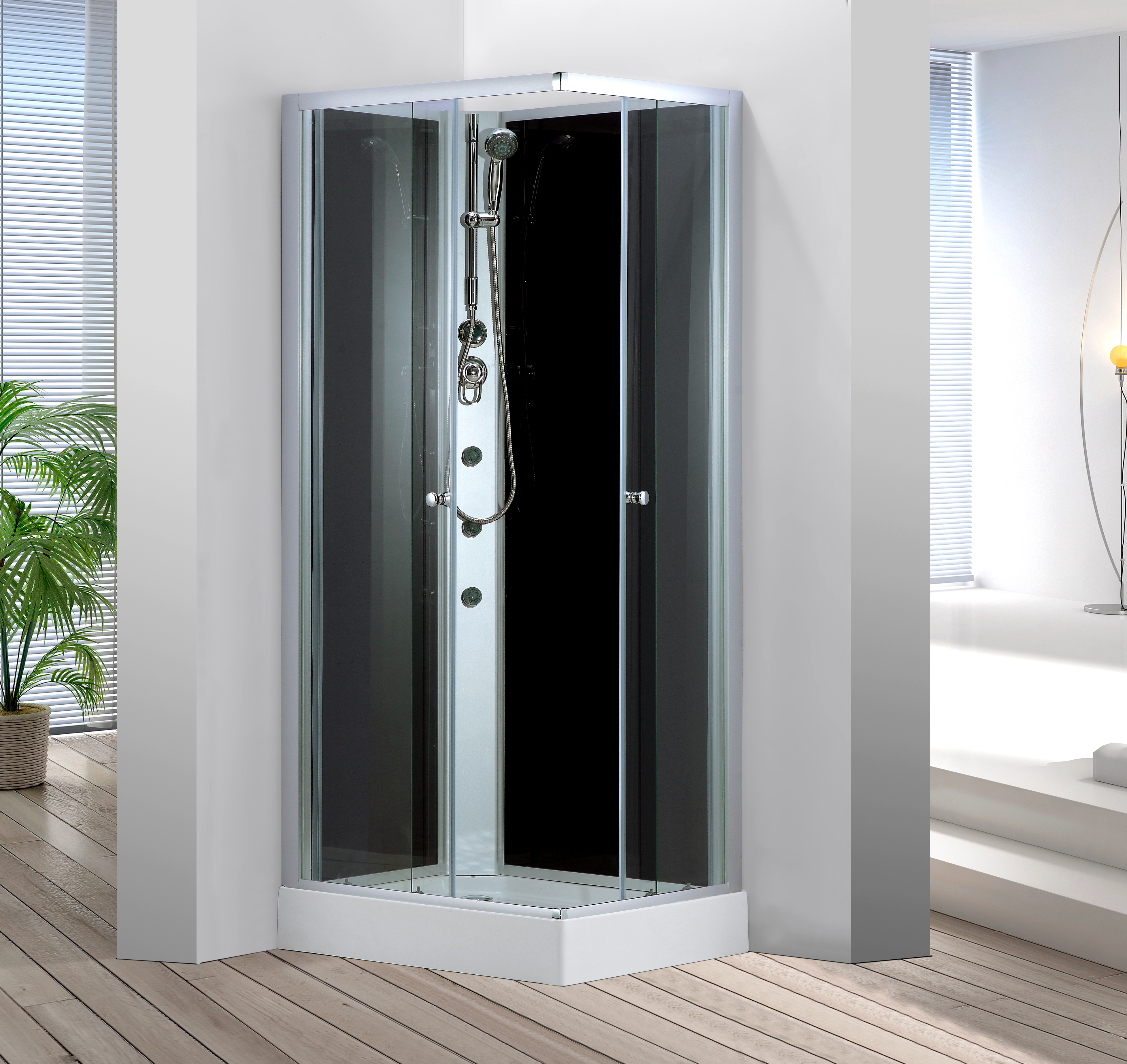 Skagen brusekabine er ideel for dig, der ønsker en komplet kabine på badeværelset. Kabinen placeres i et hjørne, hvor den firkantede model passer perfekt ind og flugter med væggene. Den er udstyret med 2 funktionelle rulledøre, hvorpå 2håndtag i krom er placeret. Dørene er af klart sikkerhedsglas med en tykkelse på 5 mm, og på kabinens bagside er der sort glas med en tykkelse på 4 mm. Den veludstyrede brusekabine rummer derudover et hvidt bundkar med afløb, og der er indbygget armatursystem med brusestang, bruseslange og håndbruser.