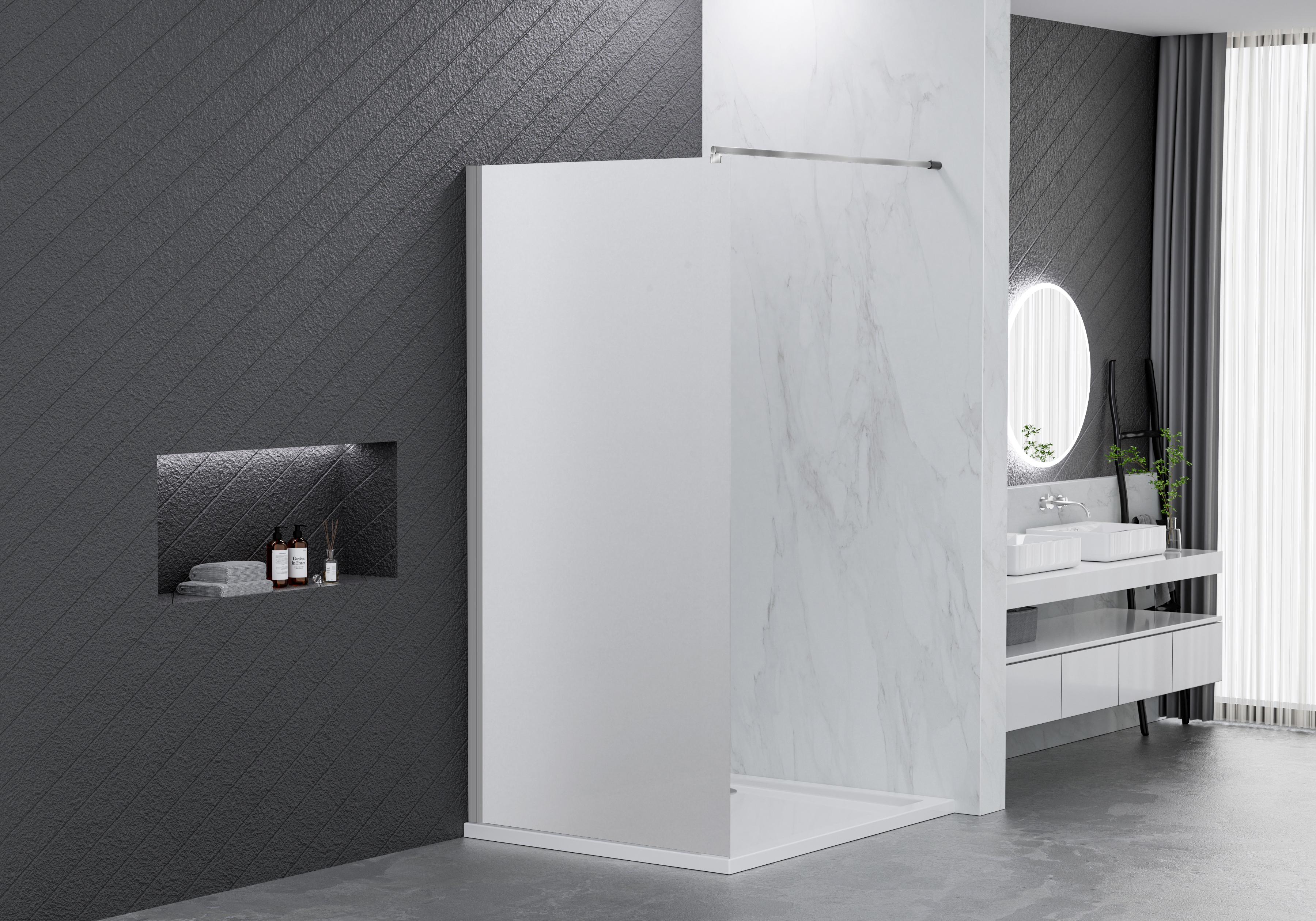 Giv dit badeværelse et løft med Bergen brusevæg, der beriger dit baderum med en klassisk og simpel stil. Brusevæggens krom profiler og frostede glas, der udgør et rolig element i din badeværelsesindretning.