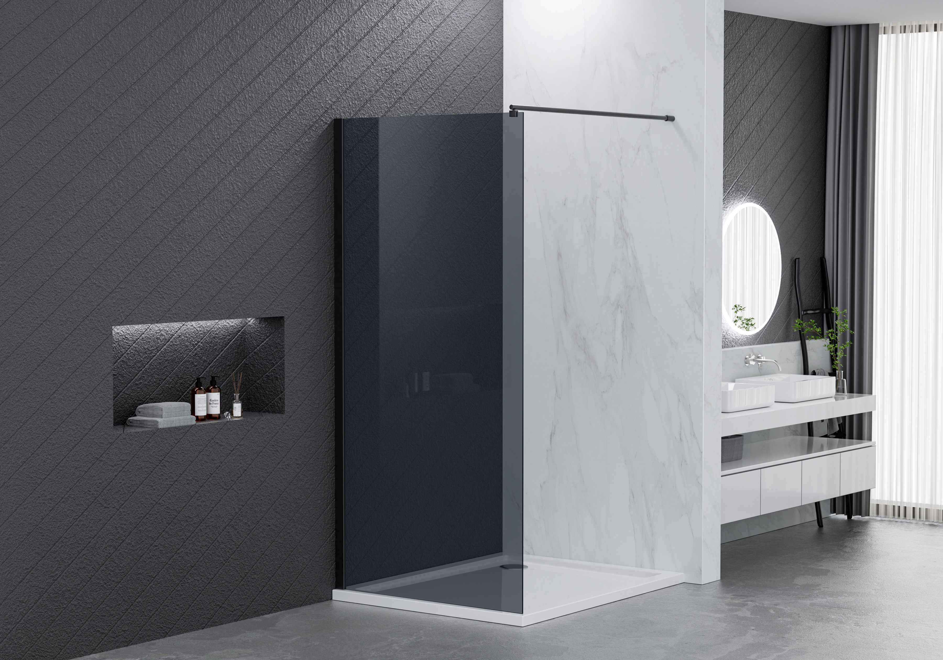 Brusevæggen leveres i røgfarvet sikkerhedsglas med en tykkelse på 6 mm. Profilerne er produceret af sort aluminium, og den medfølgende brusestang er af sort rustfrit stål. Brusestangen er ideel til ophæng af badeforhæng, og den har en længde på 118 cm og kan nemt justeres med en nedstryger. Profilen på væggen er 40 mm.