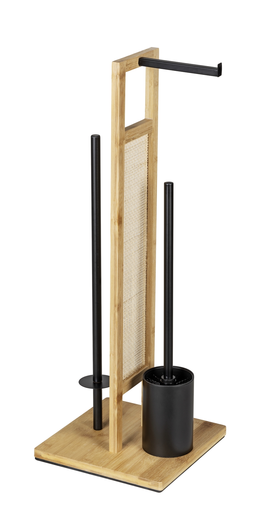 Stående toiletsæt i boho-stil, natur/sort. Indeholder toiletbørsteholder, toiletrulleholder og holder til ekstra rulle. Trendy kombination af bambus og rattan fletværk. Inkluderer toiletbørste med udskifteligt plastikbørstehoved. Mål: 18 cm i bredden, 70 cm i højden og 23 cm i dybden, børstehoved Ø 8 cm.