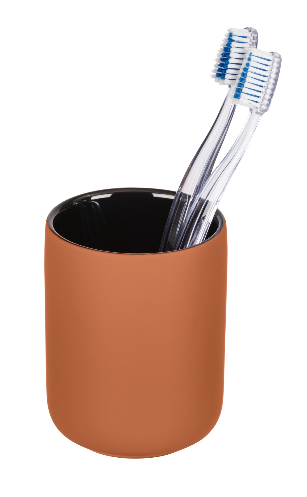 Krus med mat soft-touch overflade. Lavet af høj kvalitet og robust keramik i terrakottafarve. Ideel til opbevaring af tandbørster og tandplejeudstyr. Passende tilbehør fra Avellino-serien fås også. Mål (B/D x H): Ø 8,5 x 11 cm.