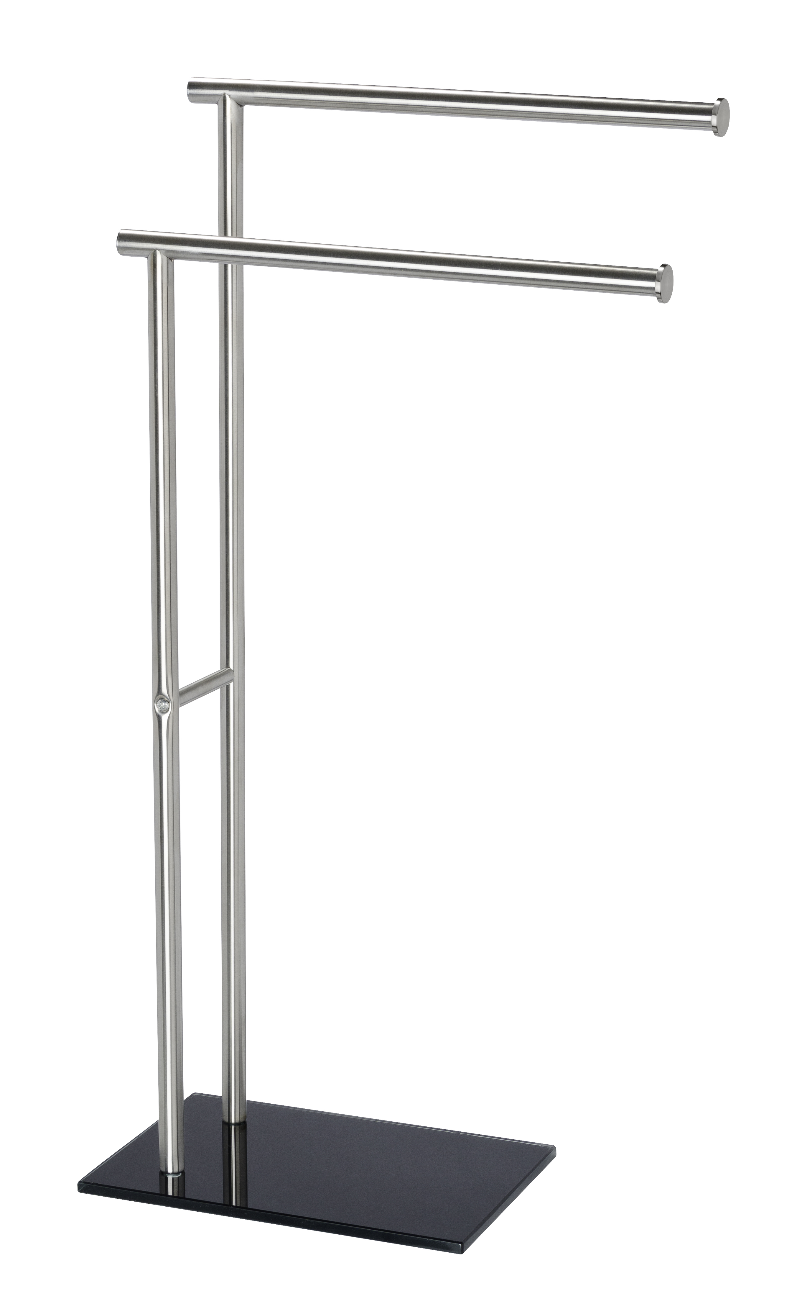 Det elegante håndklædestativ fra Lima-badeværelsesserie passer stilfuldt ind på badeværelset. Håndklædestativet tilbyder gode opbevaringsmuligheder af tøj og håndklæder med sine to parallelle opbevaringsstænger. Stativet er lavet af rustfrit stål i en mat finish, og den tunge bundplade af sort sikkerhedsglas sikrer, at stativet er sikkert og stabilt. Det fritstående stativ er enkelt og stilrent, og det placeres frit efter ønske.