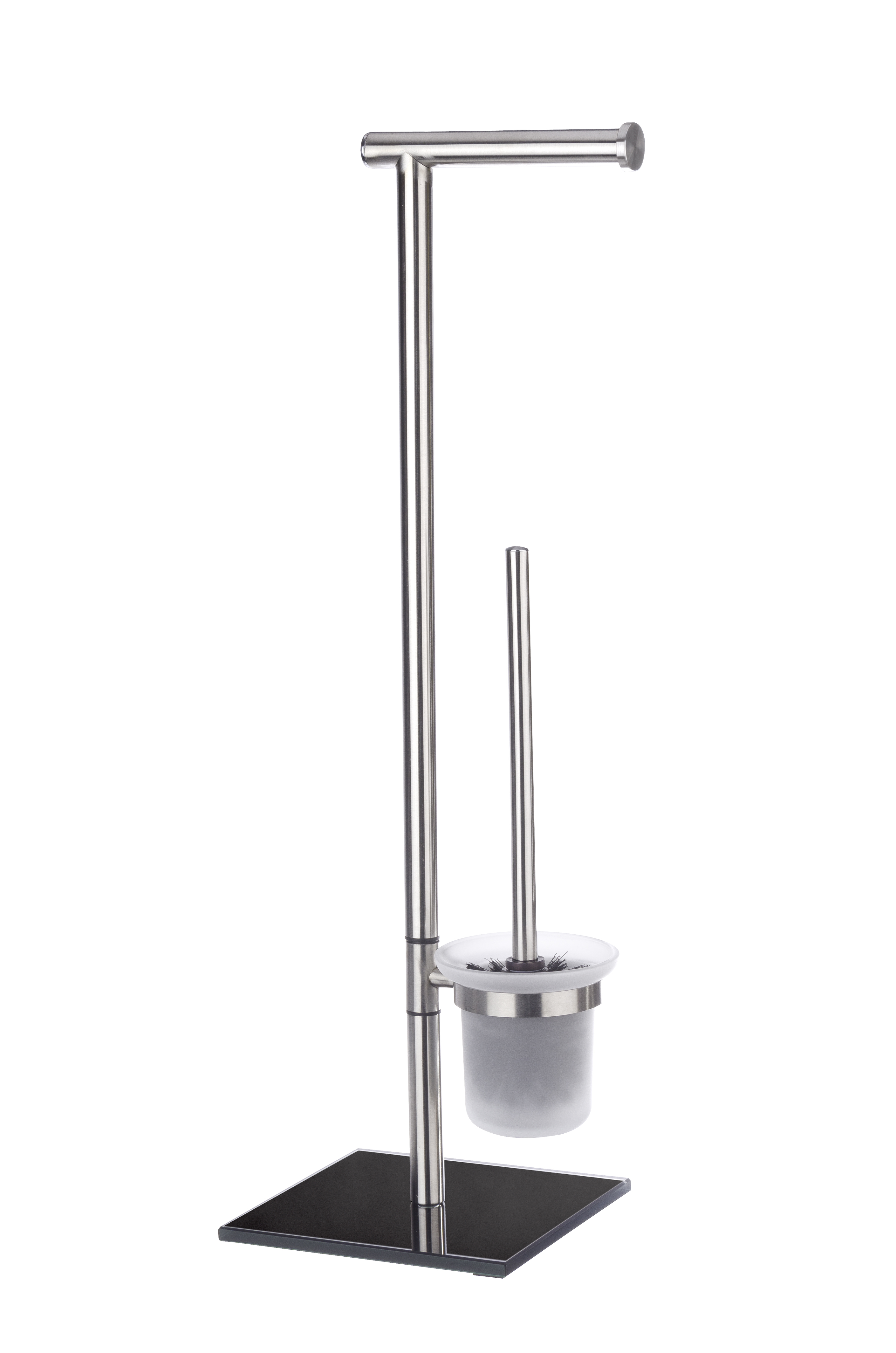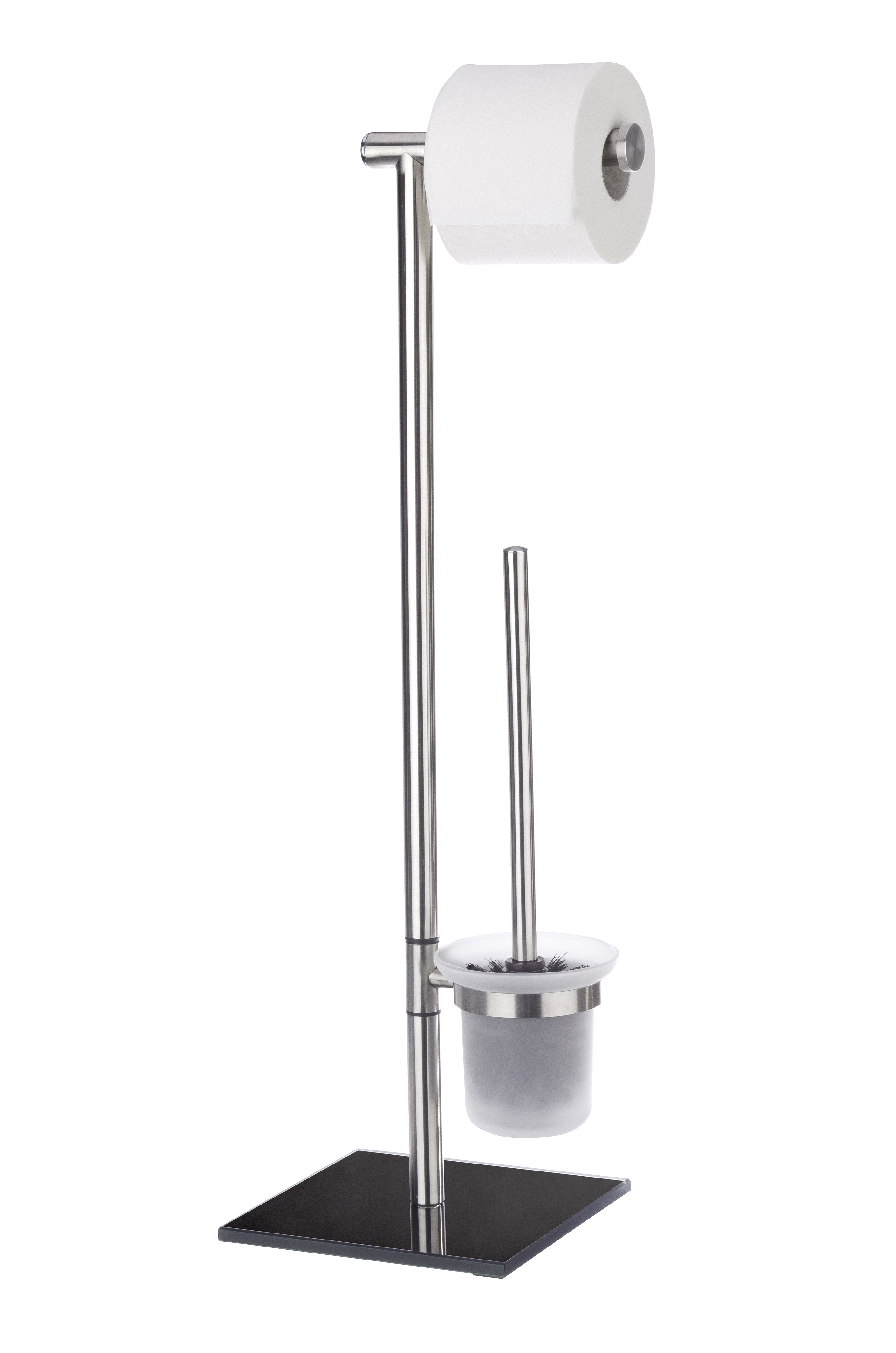Dette stativ er en kombination af en toiletpapirsrulleholder og en toiletbørsteholder. Det elegante stativ fra Lima-badeværelsesserie passer stilfuldt ind på badeværelset. Stativet er lavet af rustfrit stål i en mat finish, og den tunge bundplade af sort sikkerhedsglas sikrer, at stativet er sikkert og stabilt. Det fritstående stativ er enkelt og stilrent, og det placeres frit efter ønske. Stativet leveres med medfølgende toiletbørste, hvor det sorte børstehoved måler 7,5 cm i diameter og er udskifteligt, således at man er sikret en god hygiejne.