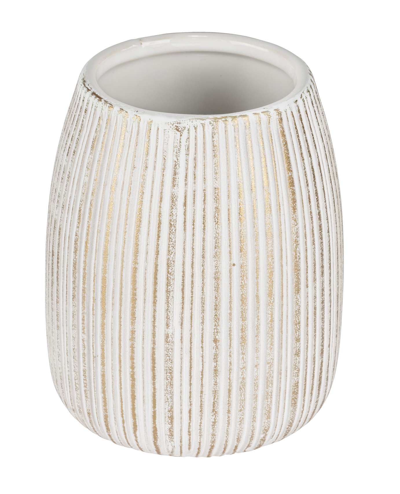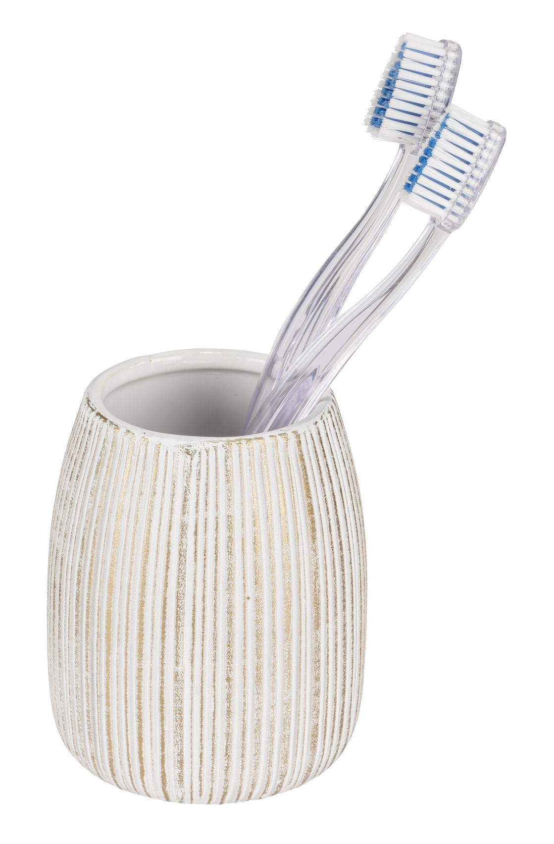 Elegant keramisk tandbørsteholder, 9 cm i diameter, 10,5 cm i højde. Stilfuldt design i guld og hvid keramik, der elegant forbedrer enhver badeværelsesindretning. Tekstureret keramik giver et smart og sikkert greb til daglig brug. Alsidigt tilbehør til tandbørster, makeupbørster eller kuglepenne WENKO kvalitetskeramik, både funktionel og dekorativ i design.