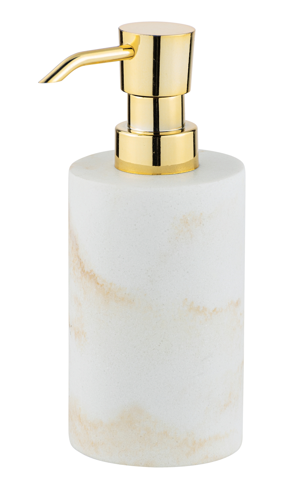 Elegant sæbedispenser med hvid og gylden marmoreret struktur. Skaber smukke detaljer i badeværelset, køkkenet og gæstetoilettet. Genopfyldelig dispenser til økonomisk dosering af flydende sæbe, opvaskemiddel eller desinfektionsmiddel. Måler 7 cm i bredden, 18 cm i højden og 10 cm i dybden, med en kapacitet på 290 ml. Lavet af polyresin og plastik.
