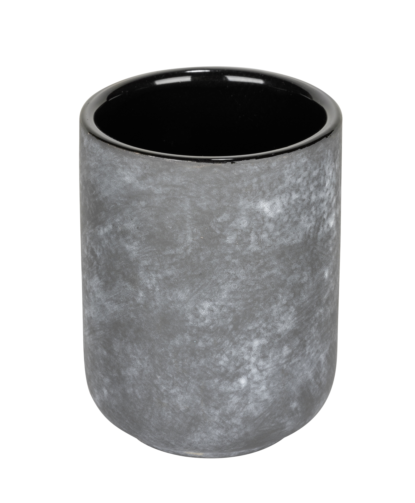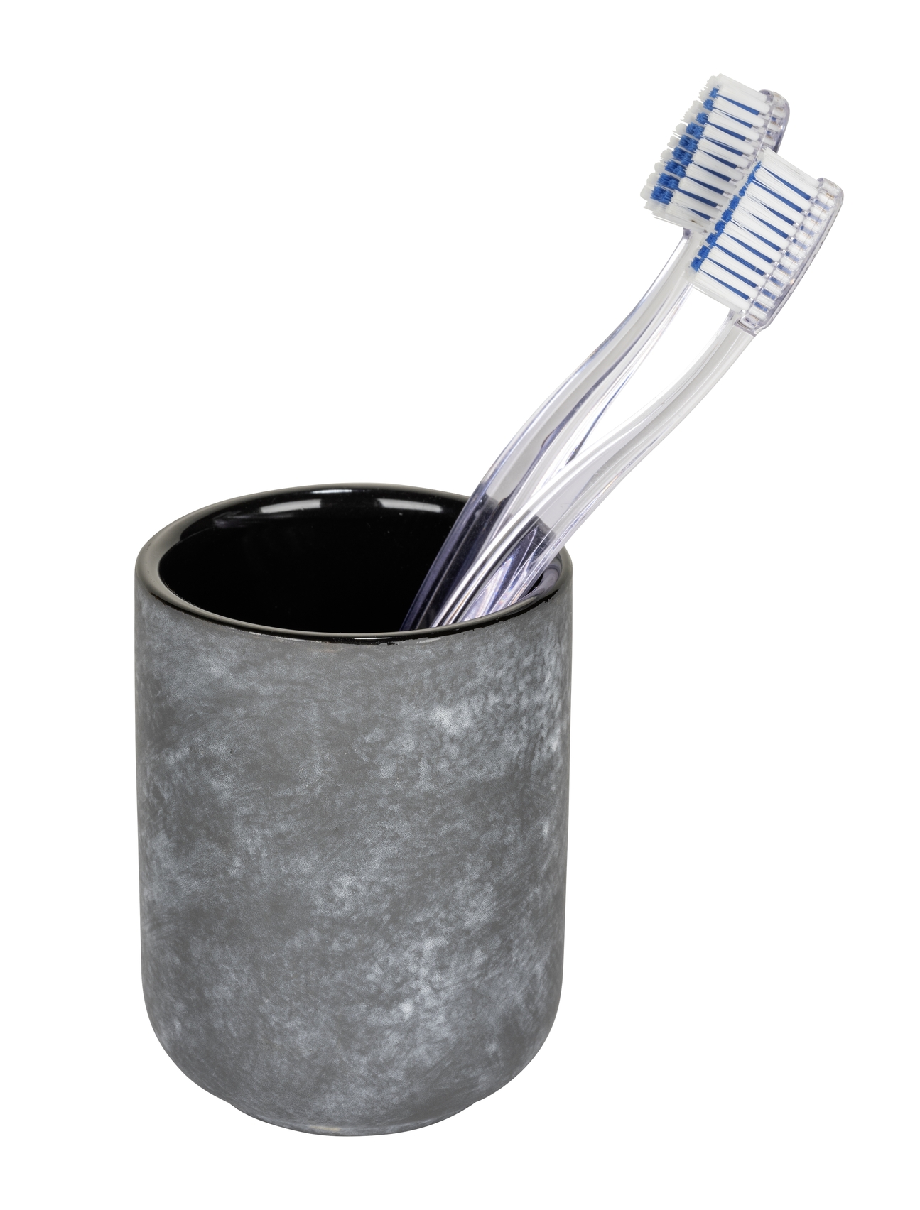 Tandkrus af høj kvalitet i keramik med beton-look design. Elegant grå/sort cylindrisk holder, Ø7,5 cm diameter, 10 cm højde. Stilfuldt keramisk badeværelsestilbehør til moderne design og organisering. Holdbar keramisk tandbørsteholder til alsidig badeværelsesbrug. WENKO keramikkrus tilføjer elegance og funktionalitet til enhver badeværelsesindretning.