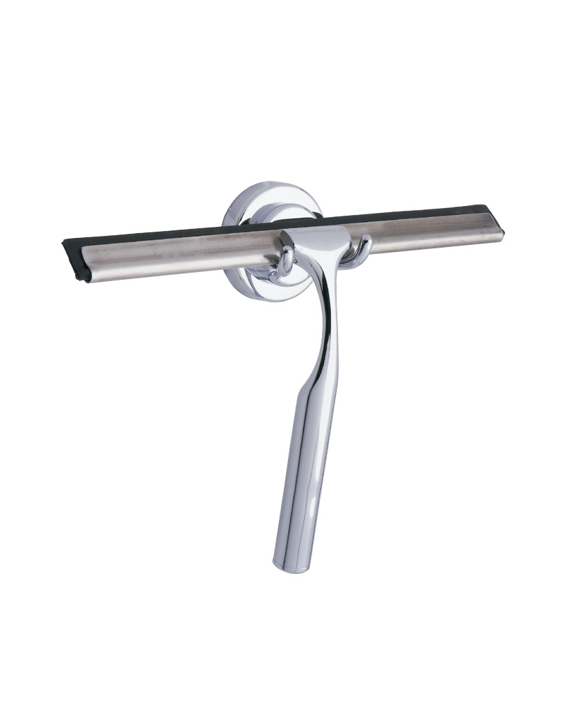 Den robuste badeværelsesskraber Terni i tung, forkromet kvalitet fjerner effektiv vand fra brusevægge og glatte overflader uden at efterlade striber – og hjælper med at forebygge kalkaflejringer. Skraberen er også velegnet til spejle, fliser og andre glatte flader. Med den medfølgende holder kan den hænges op på væggen eller brusekabinen, så den altid er inden for rækkevidde. Der medfølger en ekstra gummiliste i pakken.