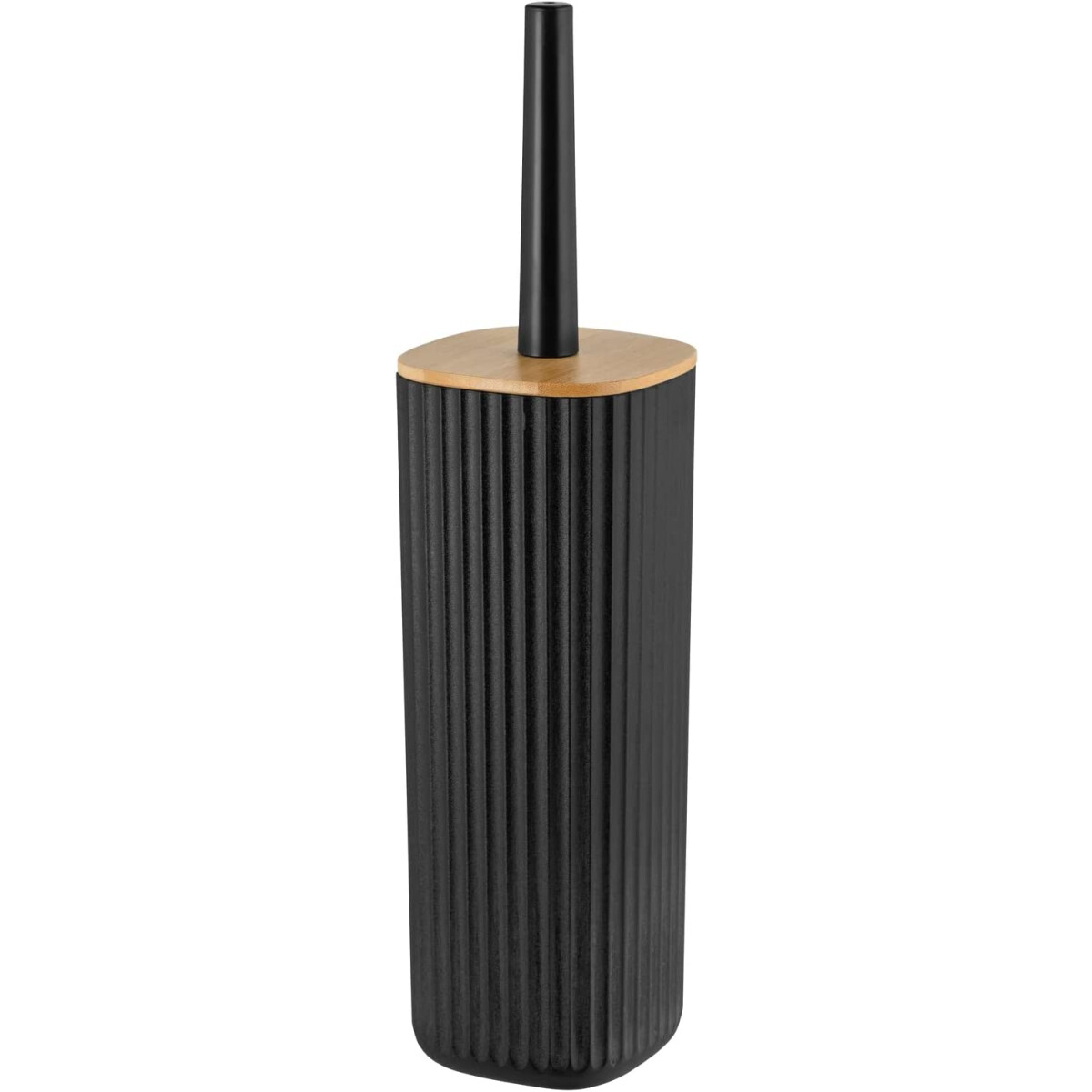 Dette toiletsæt i høj kvalitet har en sort, rillet struktur, hvor toiletbørsten diskret forsvinder ind i beholderen. Børsten har et bambuslåg, som er fastgjort til håndtaget, hvilket gør designet både ugennemsigtigt og hygiejnisk. Sættet har et udskifteligt børstehoved med en diameter på 7,5 cm. Dets mål er Ø 10 cm i bredden og 36 cm i højden, og det er fremstillet af plast og bambus.