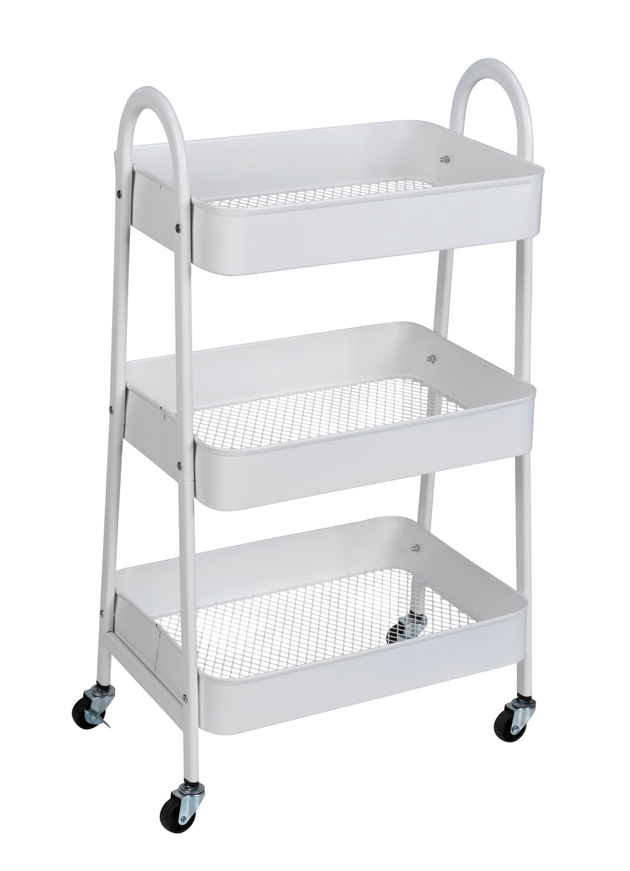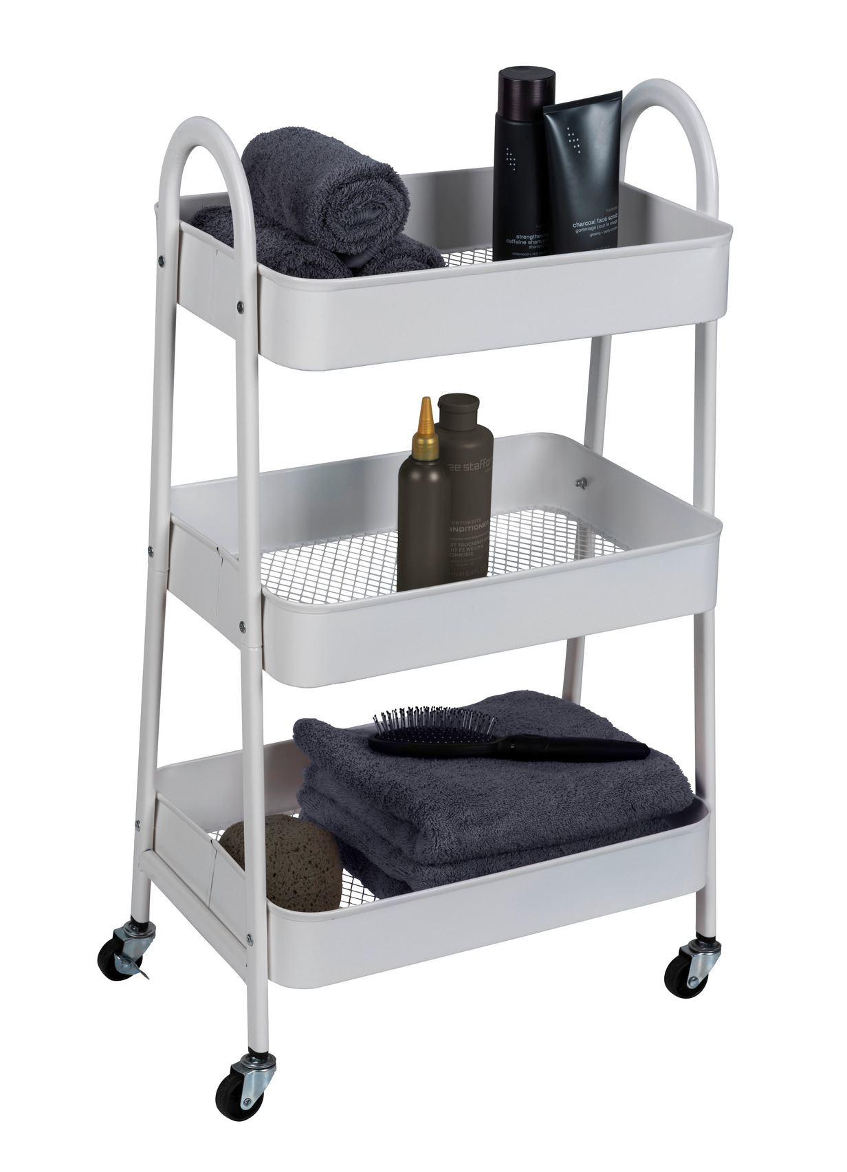 WENKO TORRIANA rullevogn i hvid er en stilfuld og funktionel opbevaringsløsning med tre rummelige hylder, der giver smart og fleksibel opbevaring til både køkken og bad, nem at flytte rundt, passer ind i ethvert rum og gør det let at holde orden med et let og moderne udtryk.