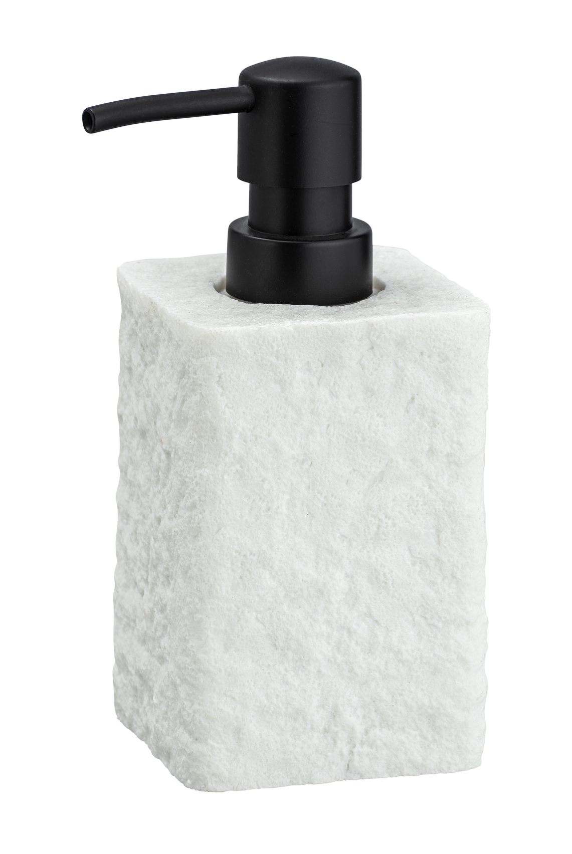 Denne høj-kvalitets sæbedispenser i naturlig stenlook i hvid er både stilfuld og praktisk. Den har en effektiv sort dispenser, der gør det nemt at dosere sæben. Dispenseren er velegnet til flydende sæbe, opvaskemiddel eller desinfektionsmiddel og kan genopfyldes for økonomisk brug. Den har en kapacitet på 300 ml og måler 7 cm i bredden, 15 cm i højden og 7 cm i dybden. Fremstillet af polyresin og plast.