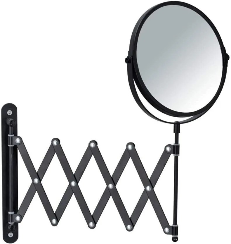 Kosmetisk spejl med 100 % spejloverflade og 3x forstørrelse. Det er lavet af sortlakeret stål og er særligt velegnet til kosmetisk brug. Spejlet har en teleskoparm, der er ekstra lang med en længde på ca. 50 cm, inklusive skruer og rawplugs til vægmontering.