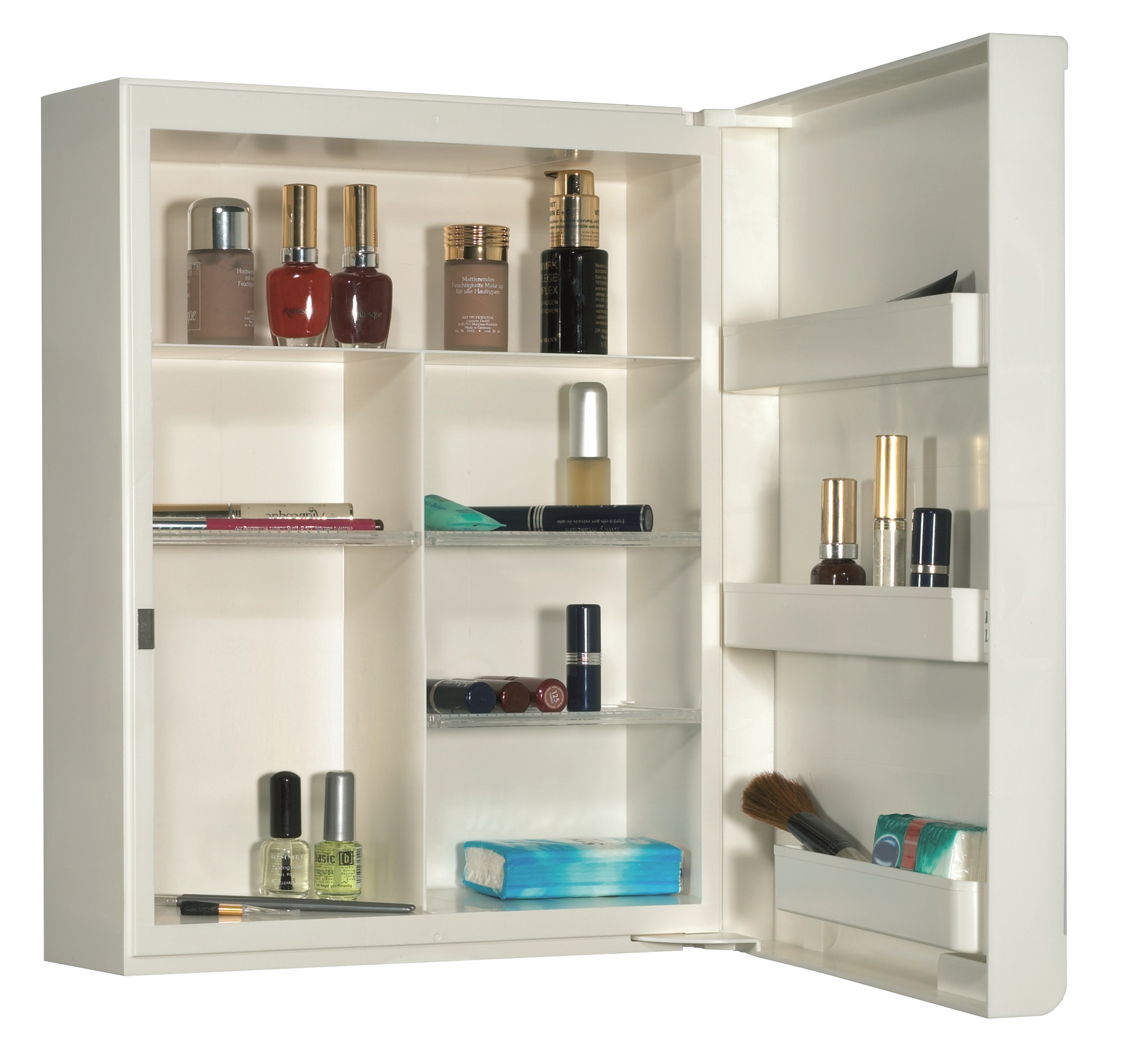 Sieper kosmetikskabet er fremstillet i plastmateriale, der gør det ekstra modstandsdygtigt over for fugt, hvilket sikrer lang holdbarhed. Det er kompakt i størrelsen, men rummer alligevel både justerbare hylder, faste opbevaringsbakker på indersiden af døren samt en elegant spejldør i krystalglas.