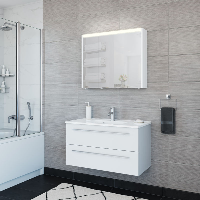 Sarto spejlskab er en funktionel og diskret opbevaringsløsning på badeværelset. Spejlskabet er udstyret med integreret lys øverst på skabet, der giver et brugbart lys til hverdagsrutinerne foran spejlet. Inde i skabet findes en skjult afbryder, samt en integreret stikkontakt.